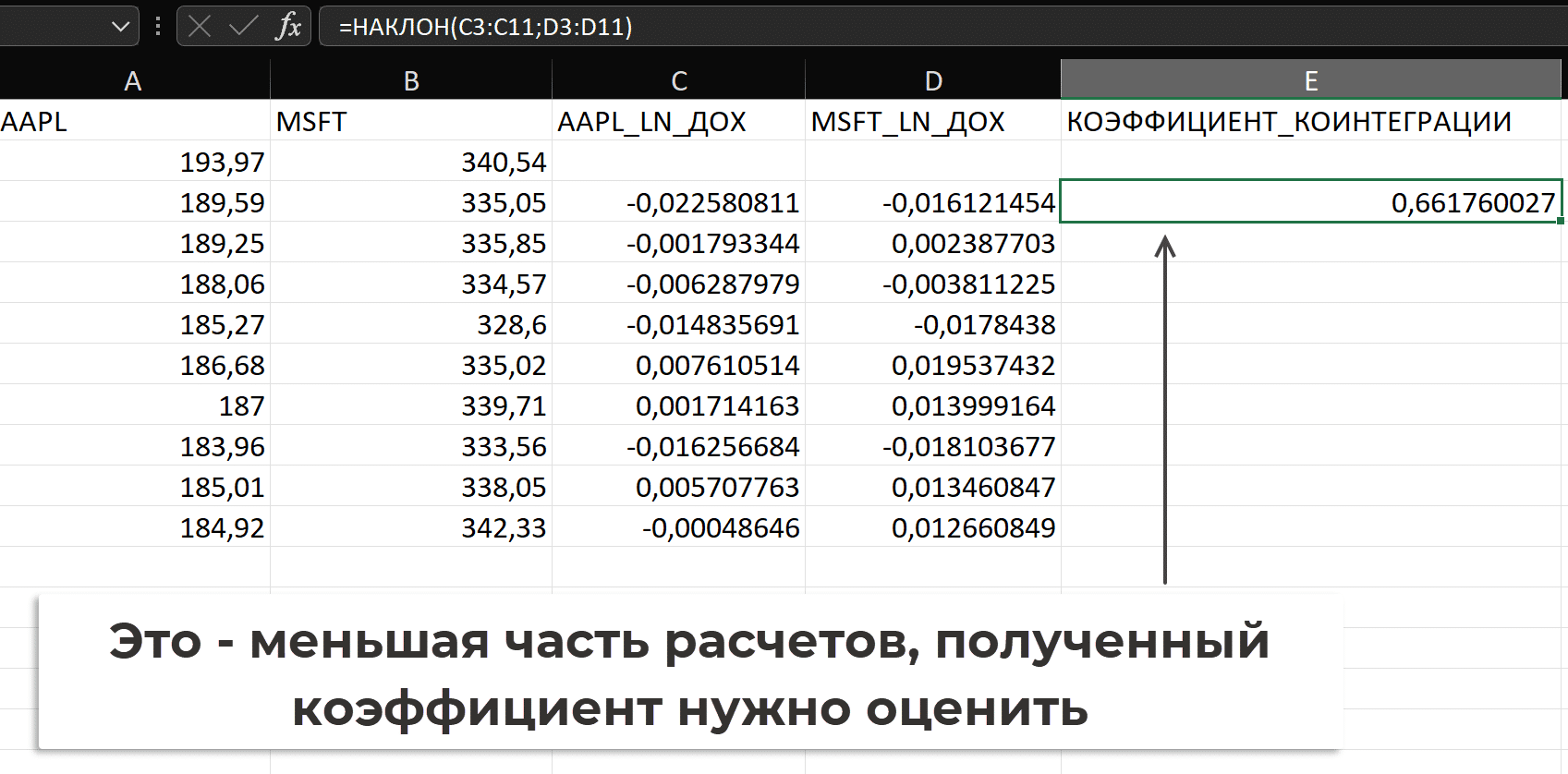 - Далее в Excel используется функция НАКЛОН. Она автоматически рассчитывает угол наклона линейной регрессии, полученное значение и есть коэффициент коинтеграции.