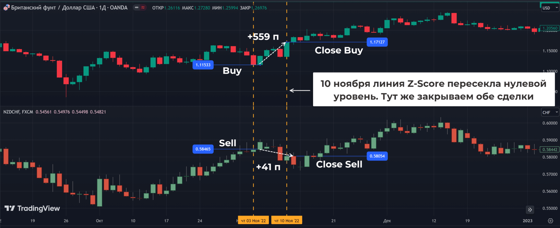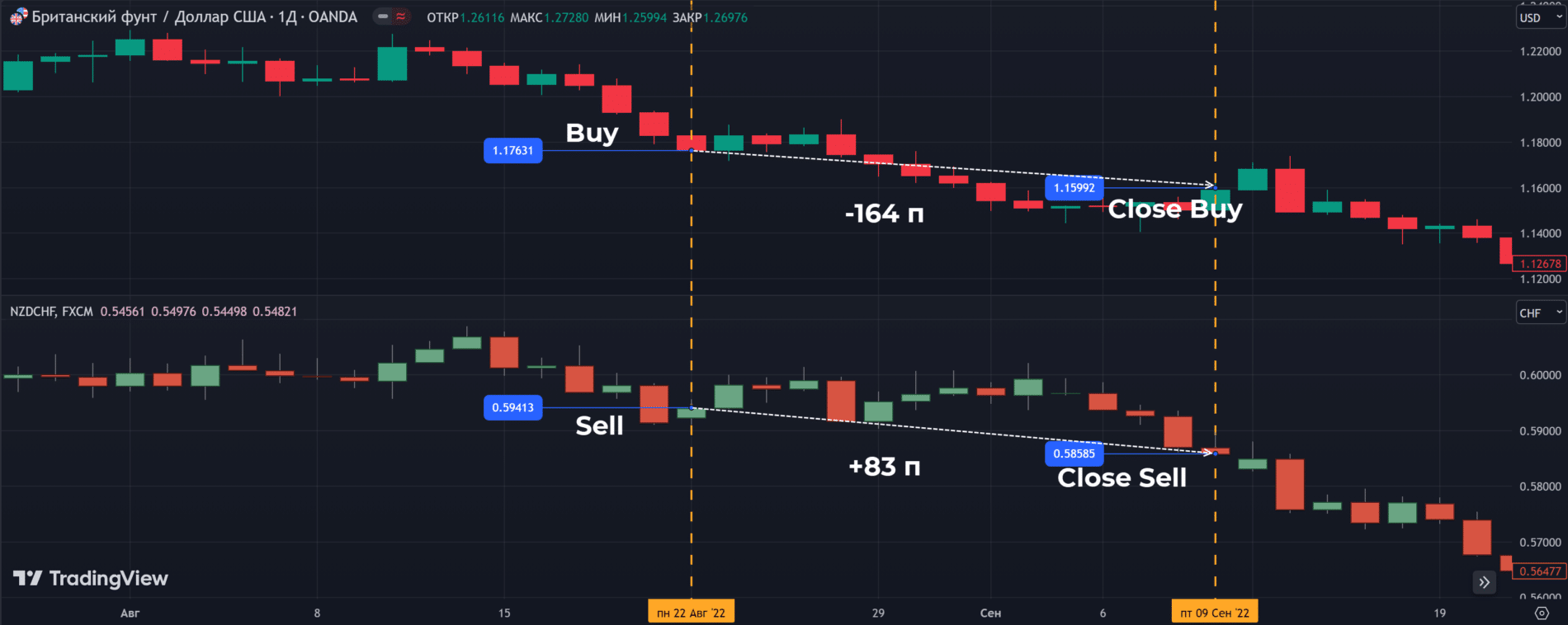 Ниже – идеальный пример, в котором с прибылью закрылись обе сделки. Всего за неделю сделка по GBPUSD принесла 559 пунктов, а по NZDCHF – 41 пункт прибыли. Такие сценарии реализуются не всегда, одна из позиций может быть убыточной, это нормально для парного трейдинга.