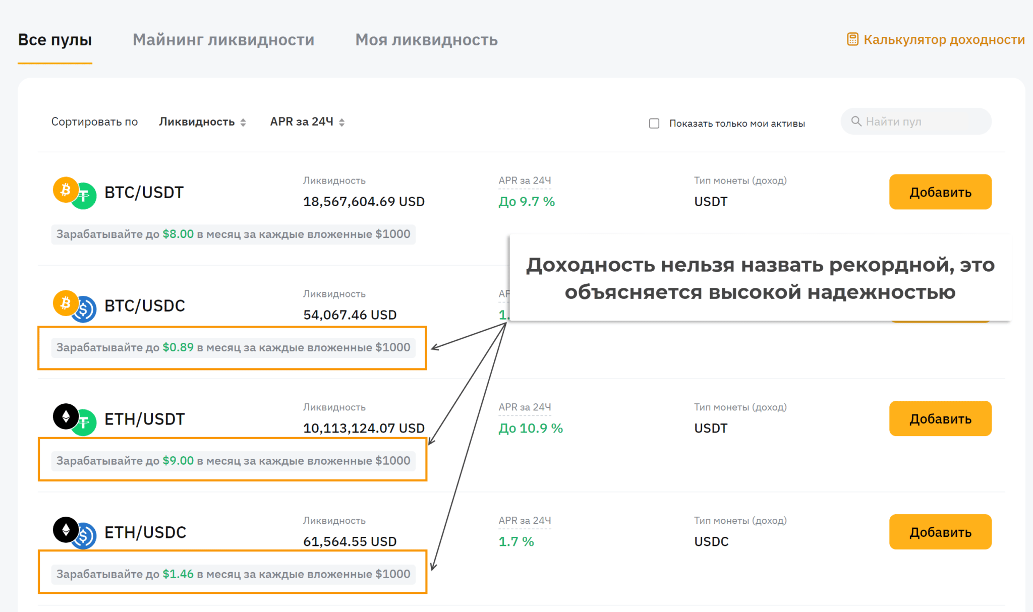 - Инвестор вносит определенную сумму криптовалюты в пул ликвидности. Соответствующие пулы есть на децентрализованных биржах. Пулы используются для поддержания ликвидности, ваши токены используются для обеспечения ликвидности торгов конкретной криптовалюты.