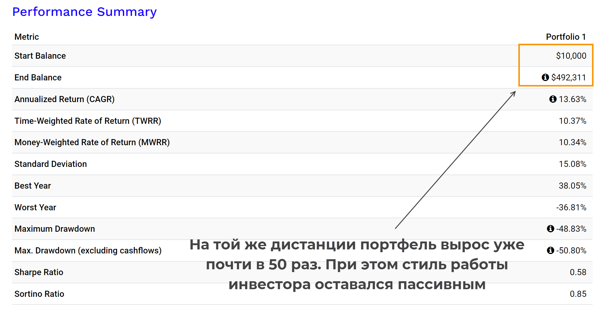 Если в этом же примере предусмотреть ежемесячное пополнение хотя бы на $100, то результат окажется еще более впечатляющим. На той же дистанции стоимость портфеля выросла уже почти в 50 раз и оказалась чуть меньше полумиллиона долларов.