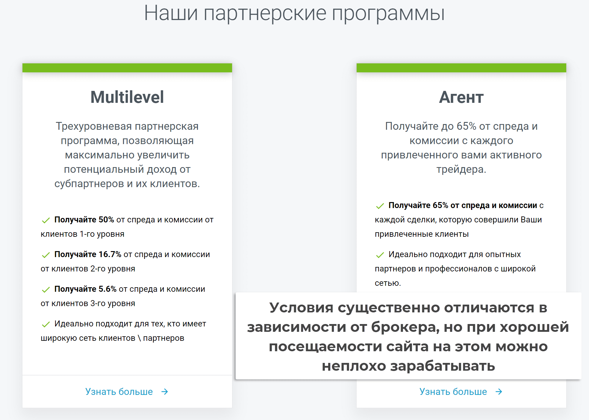 Классический пример – ресурсы, посвященные трейдингу и инвестициям. Их владельцы могут работать в рамках партнерки с брокерами (например этими или более рискованными и доходными вариантами) и зарабатывать на рефералах. В зависимости от условий брокер может платить и за сам факт регистрации нового пользователя и за их первые депозиты. Есть варианты, в которых прибыль формируется как доля от оборота реферала или дохода брокера.