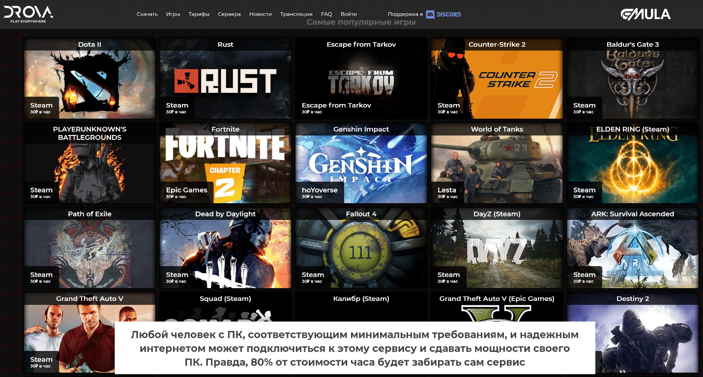 Правда, доход будет небольшим. Например, в случае с сервисом Drova пользователи платят 30 рублей в час, но большую часть этой суммы забирает платформа. Остаток за вычетом комиссии платежной системы достается владельцу ПК.