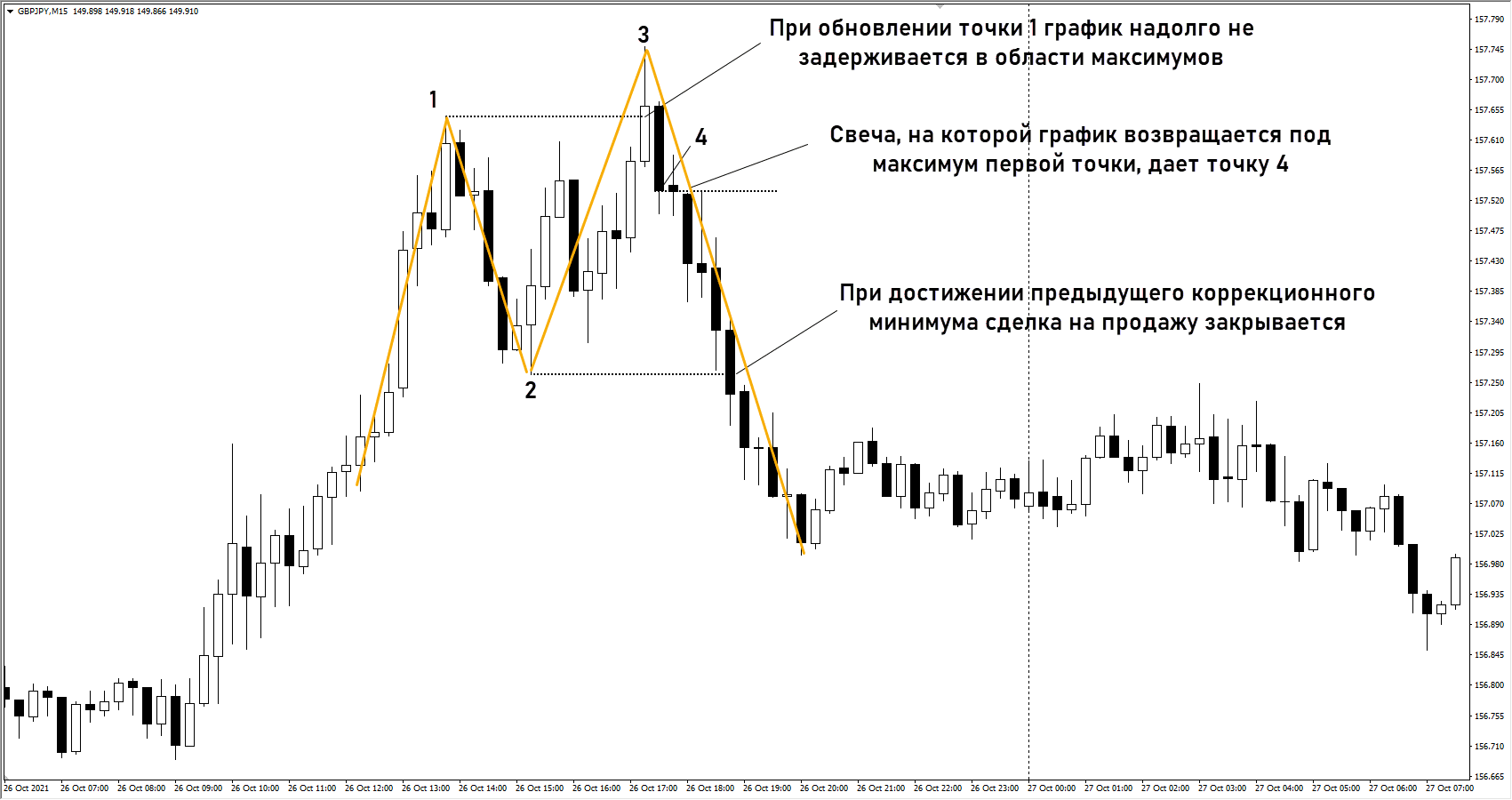 - В какой-то момент формируется очередной откат – точка 2. После этого медведи пытаются обновить предыдущий минимум, уровень 1 пробивается, но ненадолго, так формируется точка 3. При возврате в область над ним формируется точка 4 – это максимум соответствующей свечи.