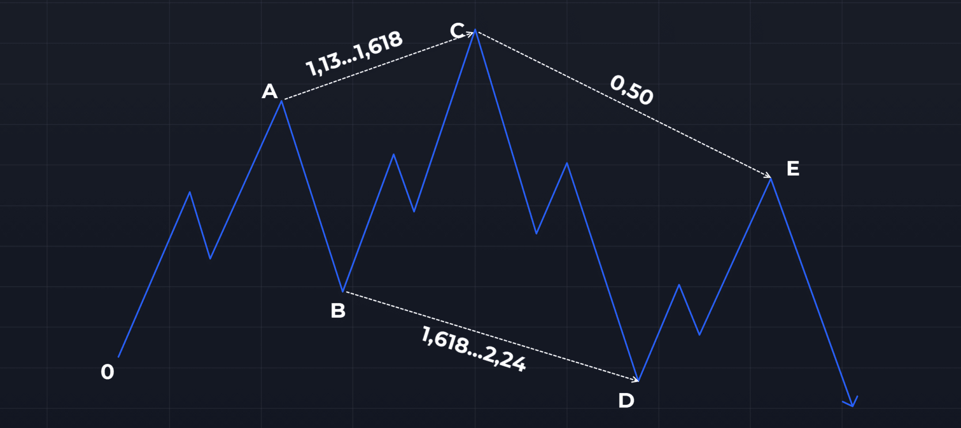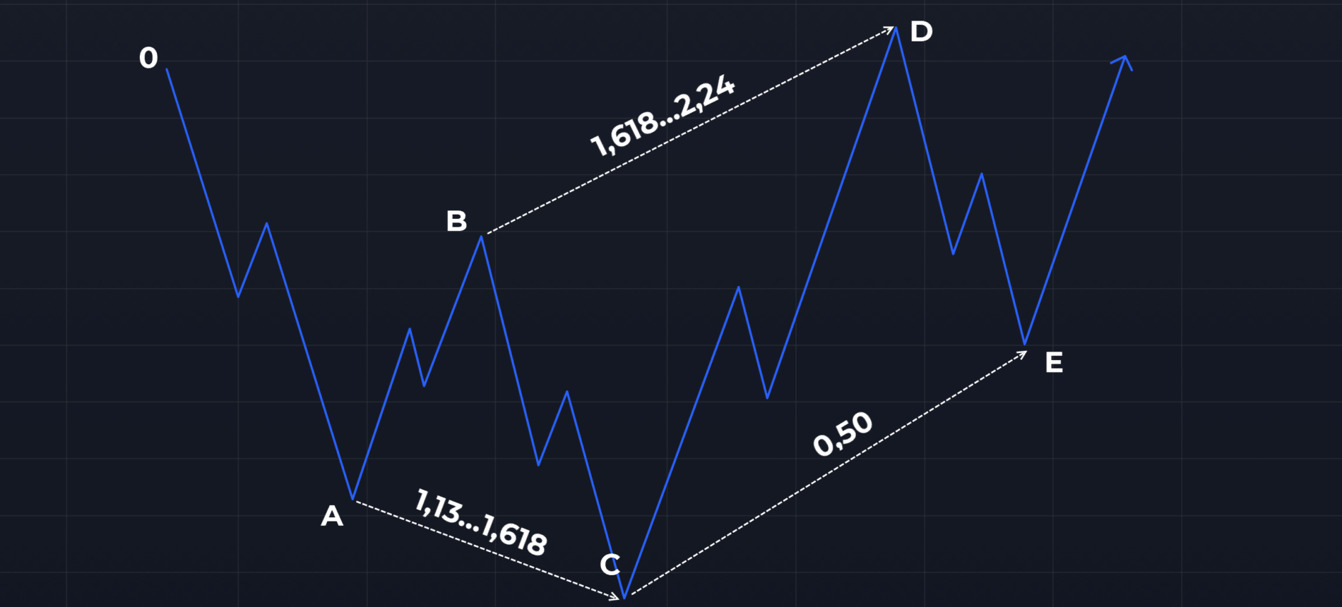- На пятой точке (Е) завершается формирование паттерна пять-ноль. High E должен находиться на уровне коррекции 50% от предыдущей нисходящей волны.