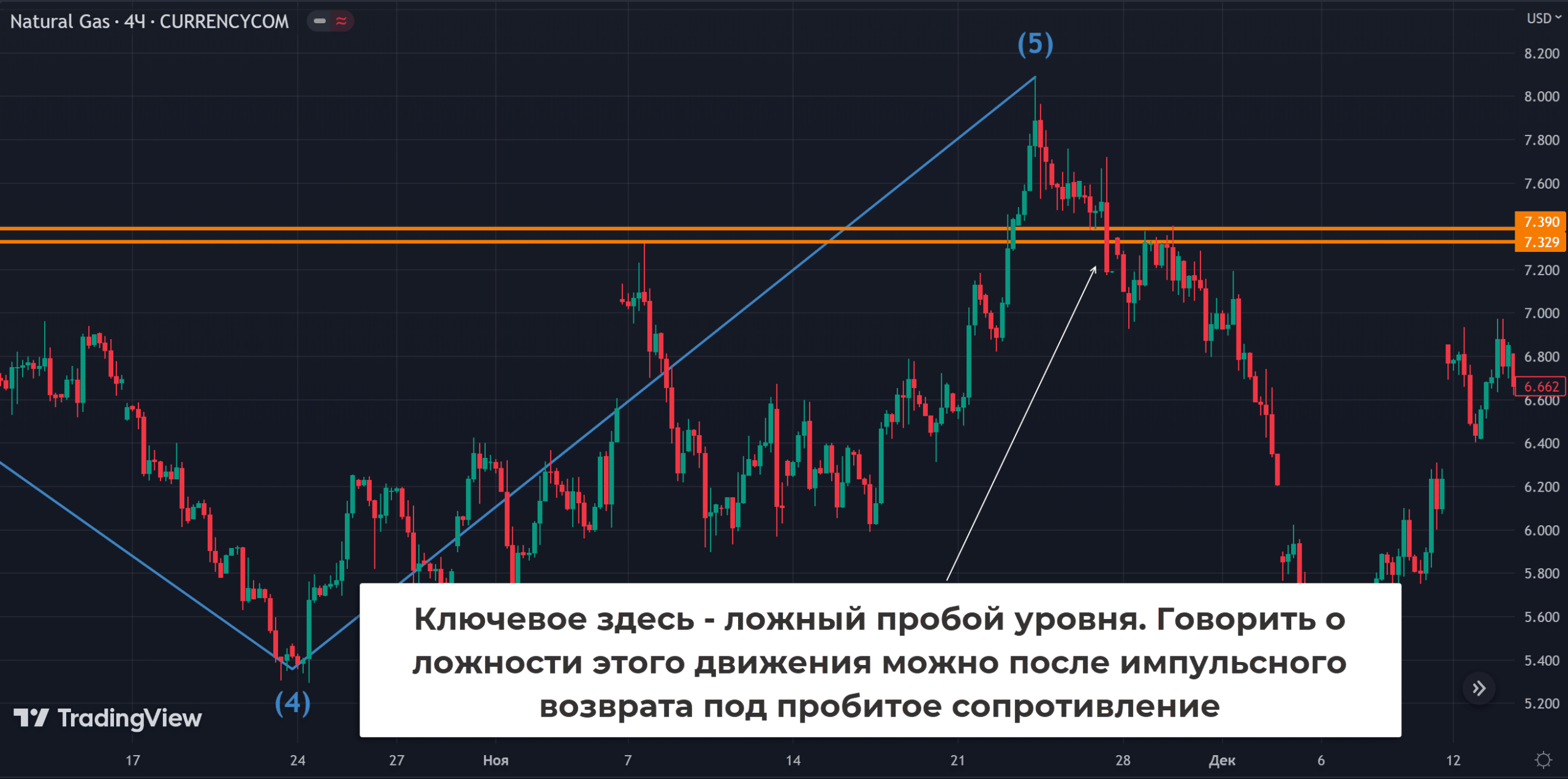 В отличие от предыдущих примеров здесь на Н4 формировался хороший паттерн для продаж. Появилось сопротивление в районе 7,33-7,40, оно пробивалось импульсом, но затем график вернулся под уровень. После ретеста снизу можно говорить о ложности пробойного движения и работать в Sell.