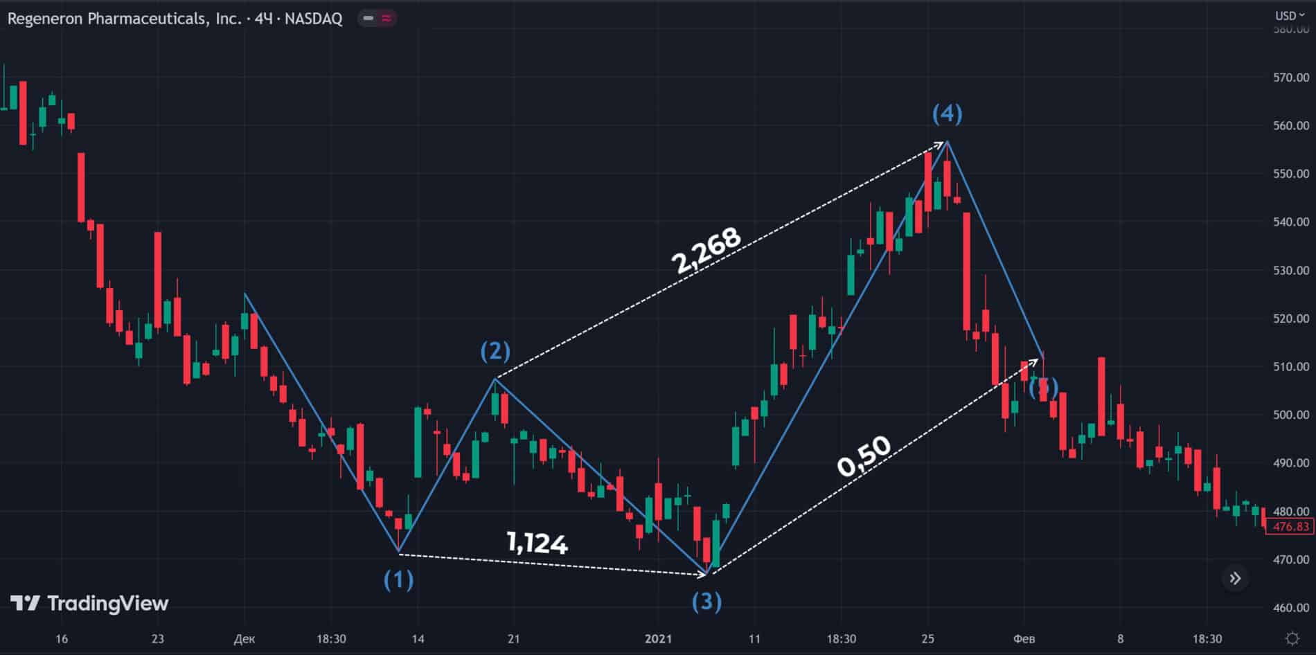 Паттерн на акциях Regeneron Pharmaceuticals показывает почему не стоит входить в рынок сразу при формировании завершающей точки модели. Соотношения выполнены, но сигнала для покупки не было. Не появилась точка входа и на младших временных интервалах, фигура не отработала.