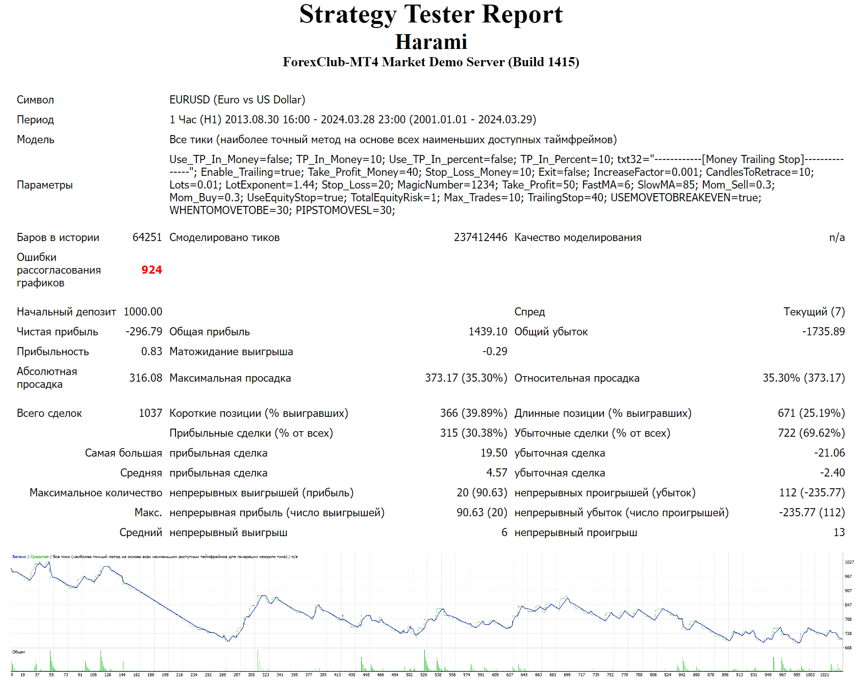 Ошибки рассогласования графиков можно игнорировать. Они не меняют картину в целом, без фильтрации торговля по Harami убыточна.