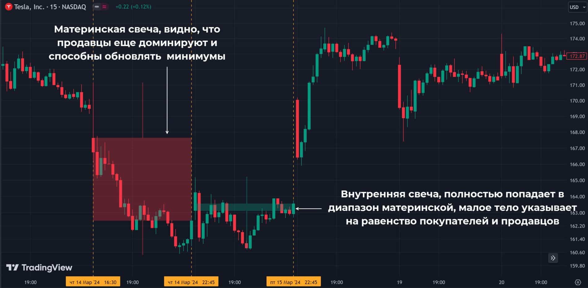 Если рассмотреть формирование паттерна на младших временных интервалах, то явно видно, как происходит остановка цены. На младших таймфреймах при формировании внутренней свечи может появляться диапазон с пробоем соответствующей границы.