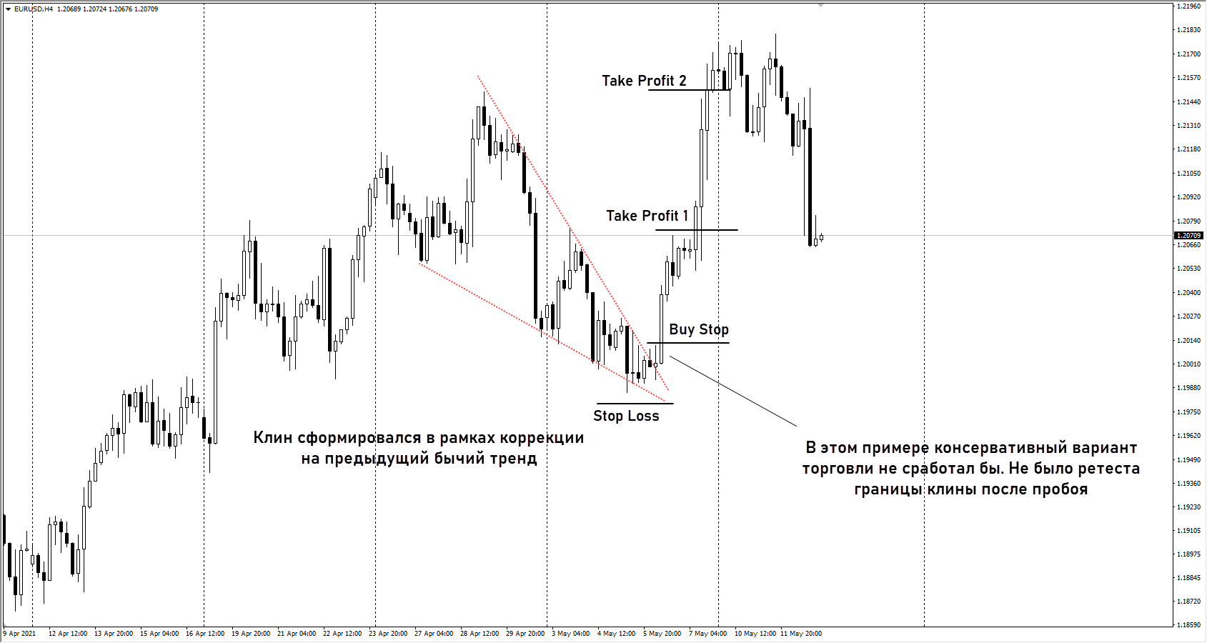 - Консервативная точка входа – сделка заключается по рыночной цене в момент ретеста пробитой границы клина. Это своего рода страховка, если паттерн не отрабатывает, то нет сработавшего стоп-лосса. Недостаток этого подхода в том, что при импульсном движении не происходит ретест границы клина.
