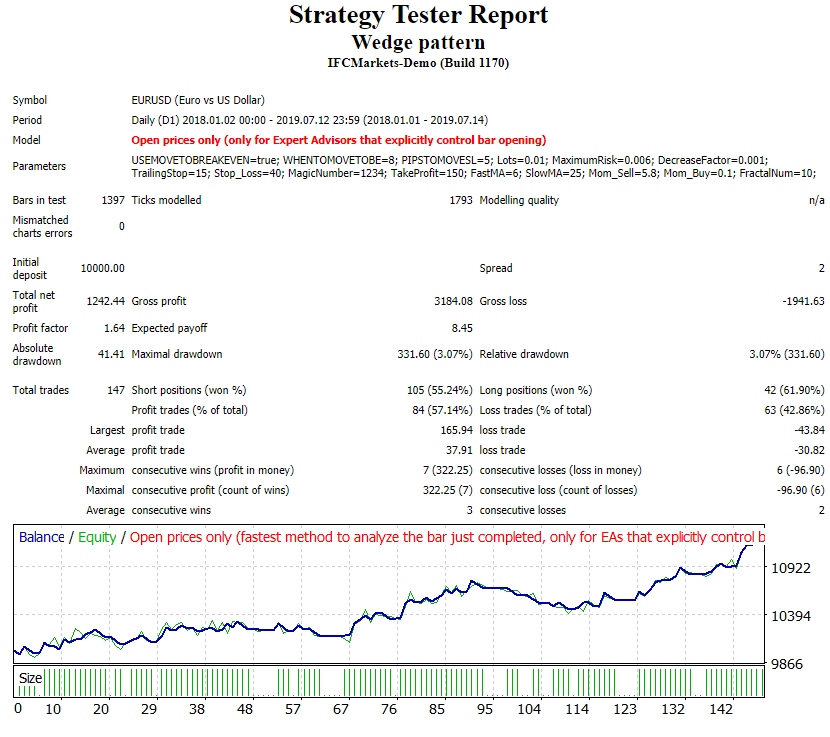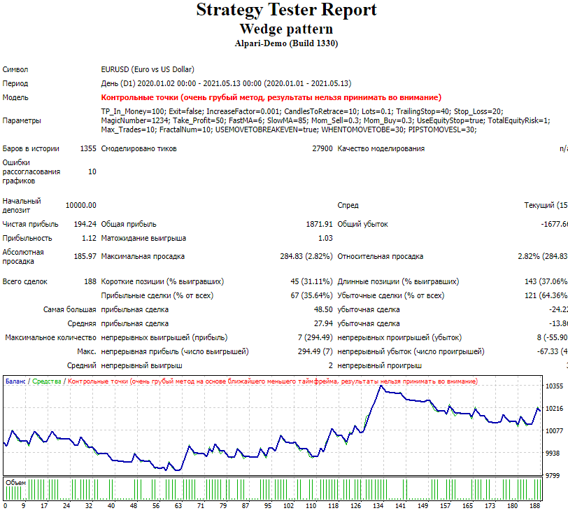 Проблема советника в том, что он, как и индикаторы, не может отфильтровывать надежные паттерны от слабых. В работу берутся все фигуры подряд, поэтому и результат не впечатляет. На это намекает и высокая частота торговли, клинья формируются сравнительно редко, а в тесте на дистанции в 1,5 года советник заключает более 100 сделок на дневном таймфрейме.