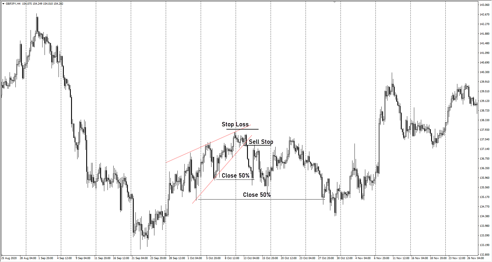- GBPJPY – клин сформировался незадолго до разворота рынка. Была возможность и для работы отложенным ордером, и для продаж по рынке после ретеста пробитой линии поддержки. Перед отработкой обновлялся максимум паттерна, так что сделка могла закрыться с убытком.