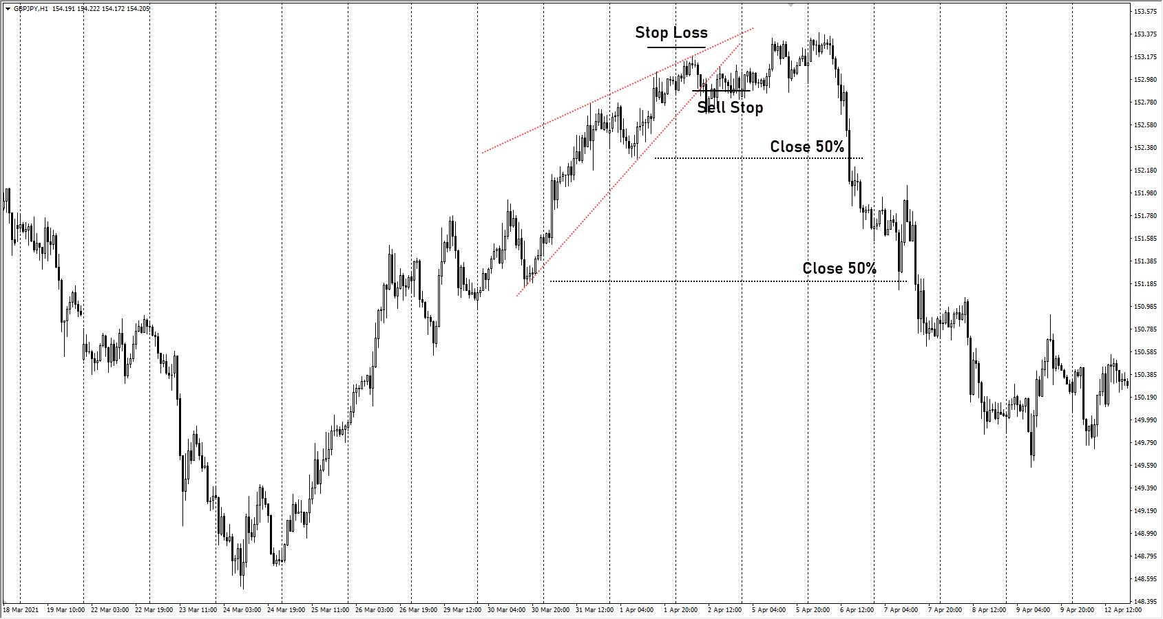 паттерн клин на графике USDJPY - USDJPY, в рамках одной из коррекций после нисходящего движения сформирован очередной клин. Отложенный ордер Sell Stop принес профит. В этом случае сделку пришлось держать открытой несколько дней.