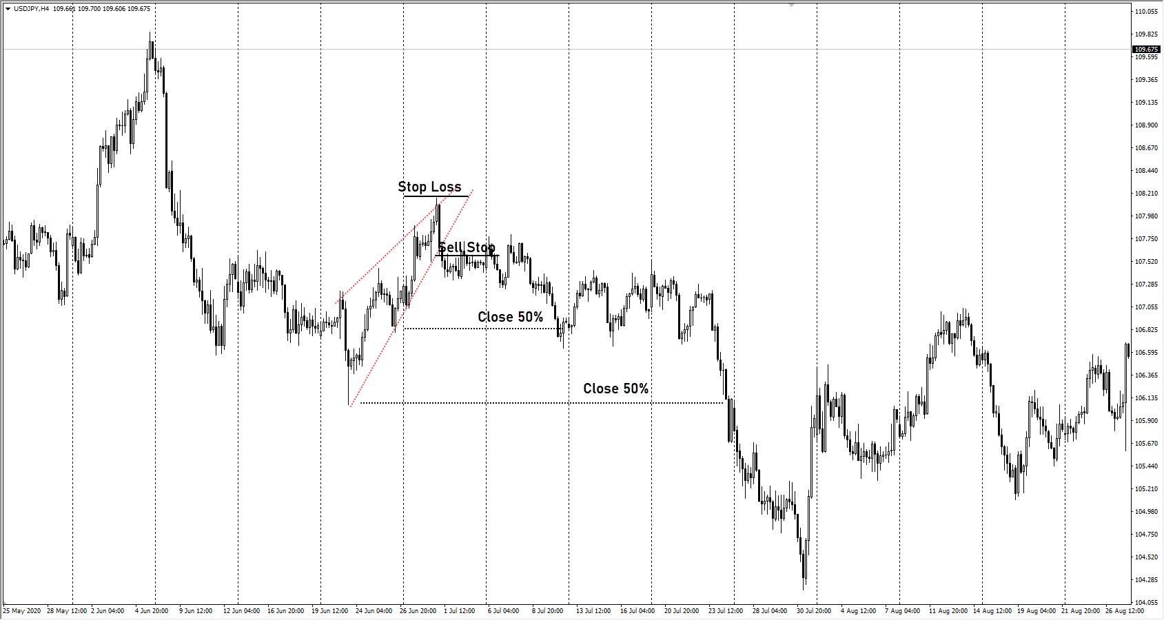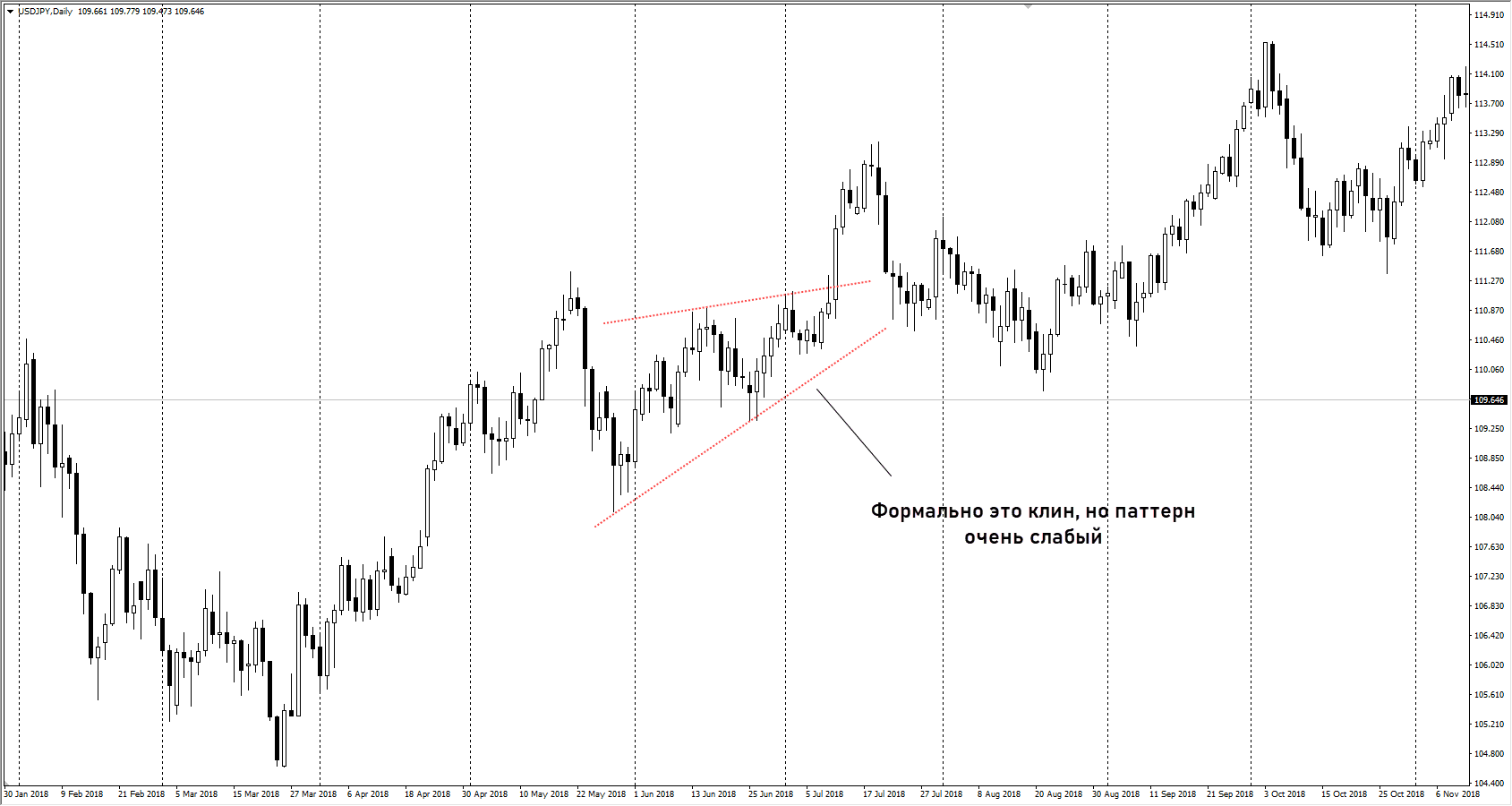 паттерн клин на графике USDJPY (2) - Иногда паттерн формально соответствует правилам, но на него не стоит обращать внимание. В следующем примере во время формирования клина не был обновлен максимум предыдущего движения, если рассматривать его как завершение коррекционного движения, то откат был слишком глубоким. В итоге паттерн не соответствует ни сценарию разворота тренда, ни формату завершения коррекции.