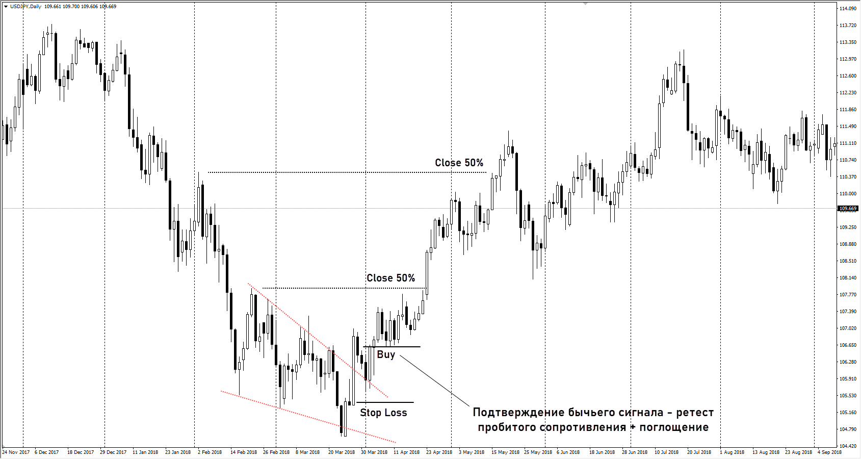 паттерн клин на графике GBPJPY (H4) - USDJPY – пример того, что паттерны формируются и на дневном таймфрейме. В клине ниже получена идеальная точка входа, после пробоя сопротивления состоялся его ретест и подтверждение в виде бычьего поглощения. Можно было входить по рынку с минимальным риском. Клин довольно пологий, поэтому фиксировать прибыль можно по локальным экстремумам предыдущего нисходящего движения.
