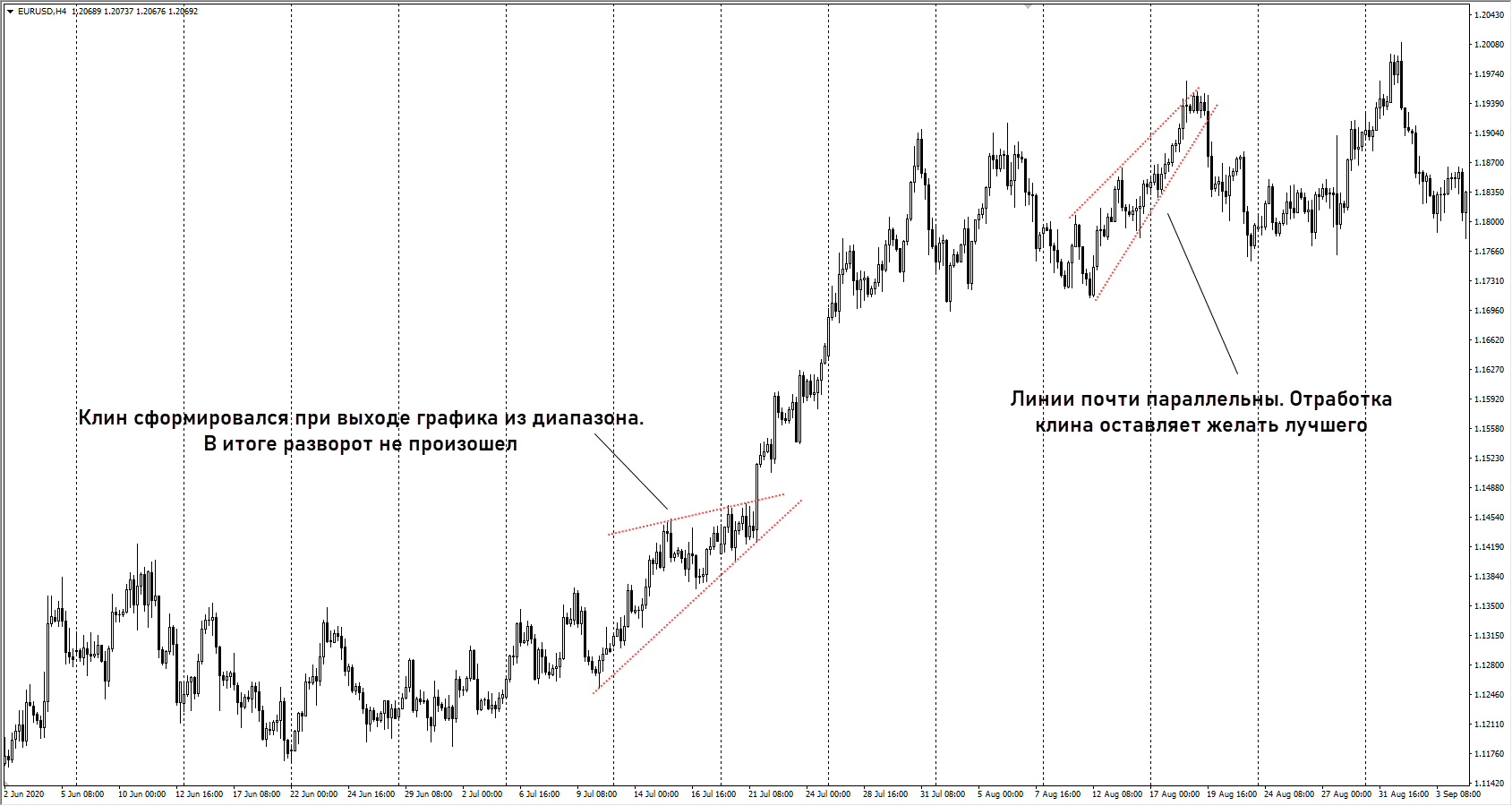 Также важна форма фигуры, линии должны сходиться, если продлить их вправо. Если обе линии почти параллельны, то эту конструкцию лишь с натяжкой можно назвать клином. Она может отработать, но потенциал таких конструкций ниже.