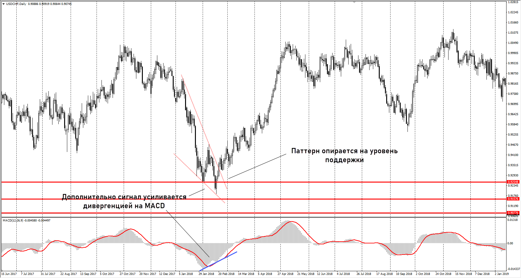 Показания индикаторов, например, дивергенция на MACD или выход осцилляторов из зон перепроданности-перекупленности. Комбинация этих условий делает разворотный сигнал очень сильным.