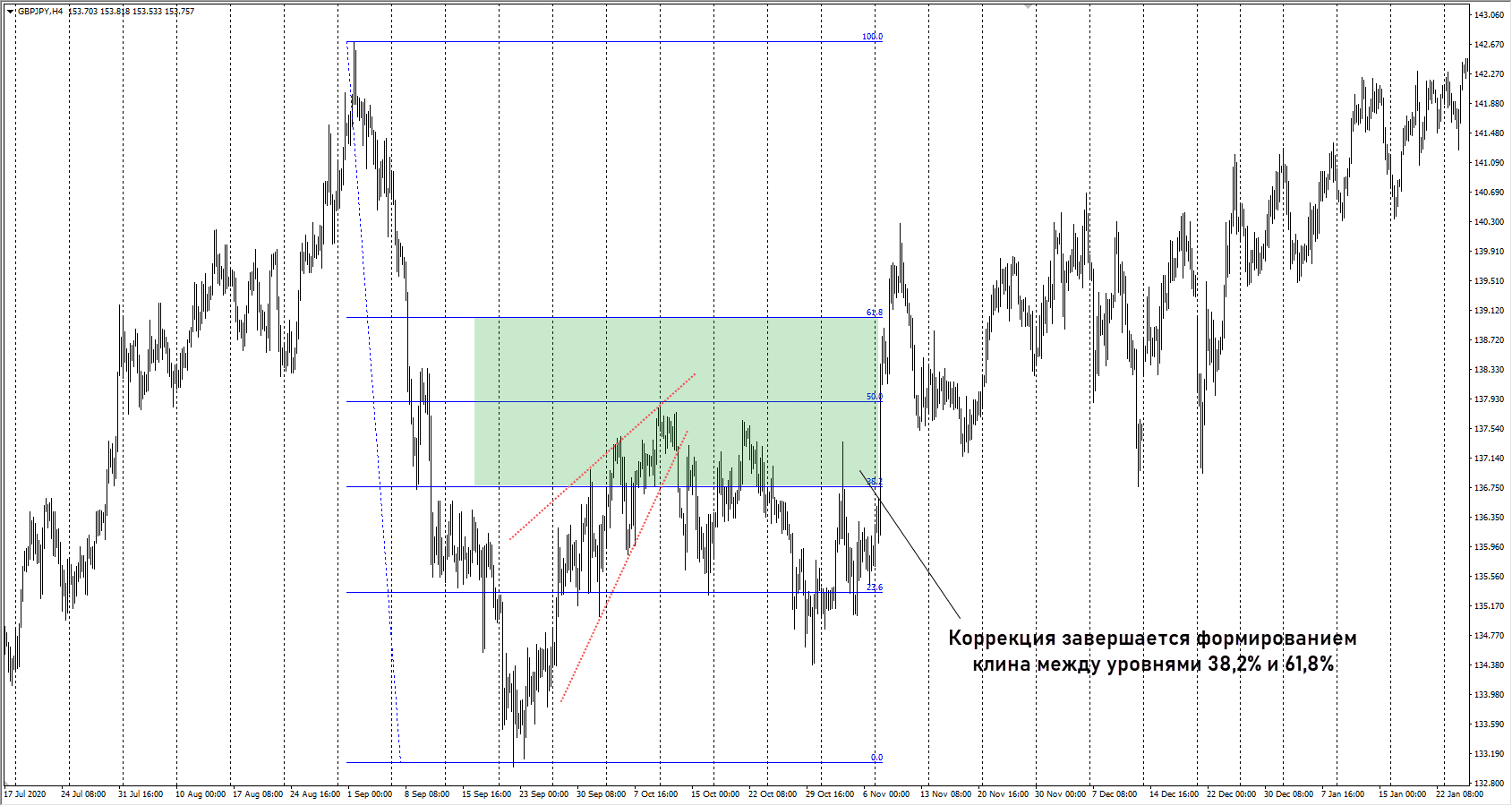 Если клин формируется на коррекционном движении, стоит оценивать глубину отката. Желательно, чтобы коррекция завершалась в диапазоне 38,2%-61,8%, это повышает шансы на возобновление тренда.