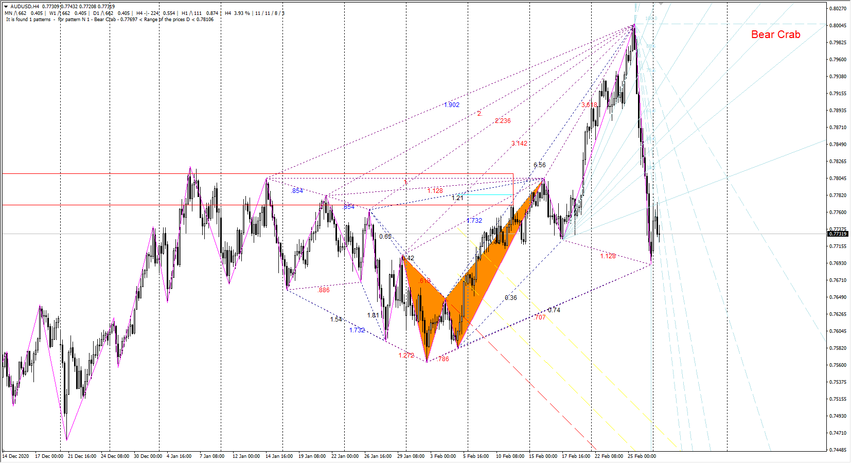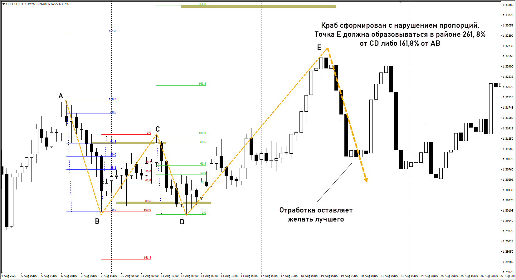 Критически важно выполнение ключевых соотношений между отдельными элементами паттерна. В примере ниже точка D смещена слишком глубоко относительно В, отрезок DE оказался слишком коротким, он не дотягивается до целевых уровней. В итоге конструкция отработала, но не лучшим образом. не достигнут район минимумов краба (это первый целевой уровень).