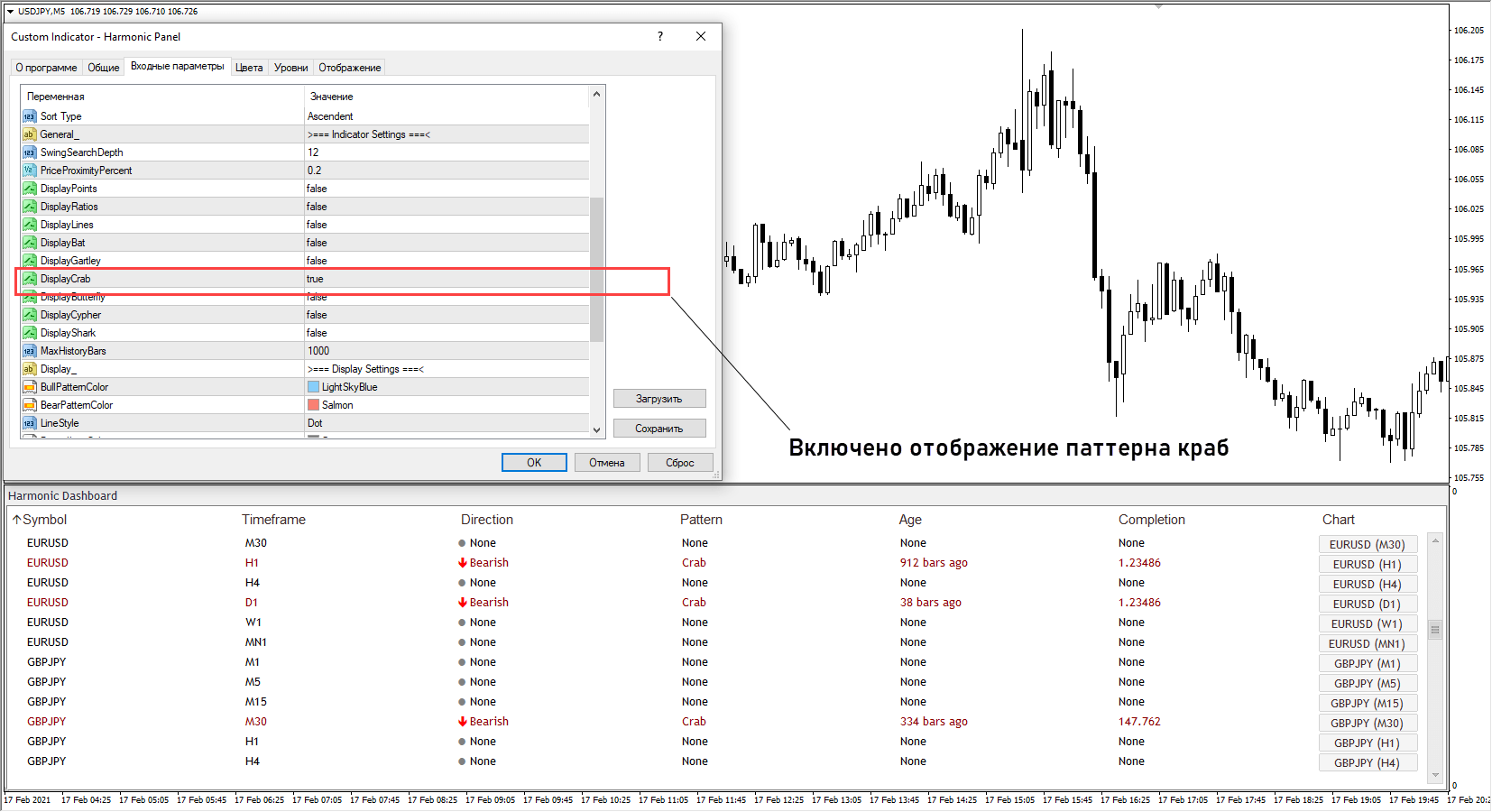 - Harmonic Panel. График не захламляется ненужными построениями, вместо этого «в подвале» отображается информационная панель с описанием гармонических паттернов на разных валютных парах. Через настройки можно отключить все фигуры кроме краба. В информационном окне в правой части находятся кнопки для быстрого перехода на нужный график и таймфрейм.