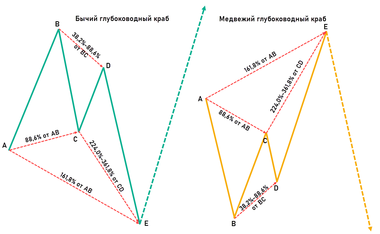 Есть и подвид этой конструкции под названием Deep Crab или глубоководный краб. Единственное отличие этой модификации заключается в более глубоком коррекционном движении при формировании точки С. Отрезок ВС предполагает более глубокий откат вплоть до 88,6% от АВ.