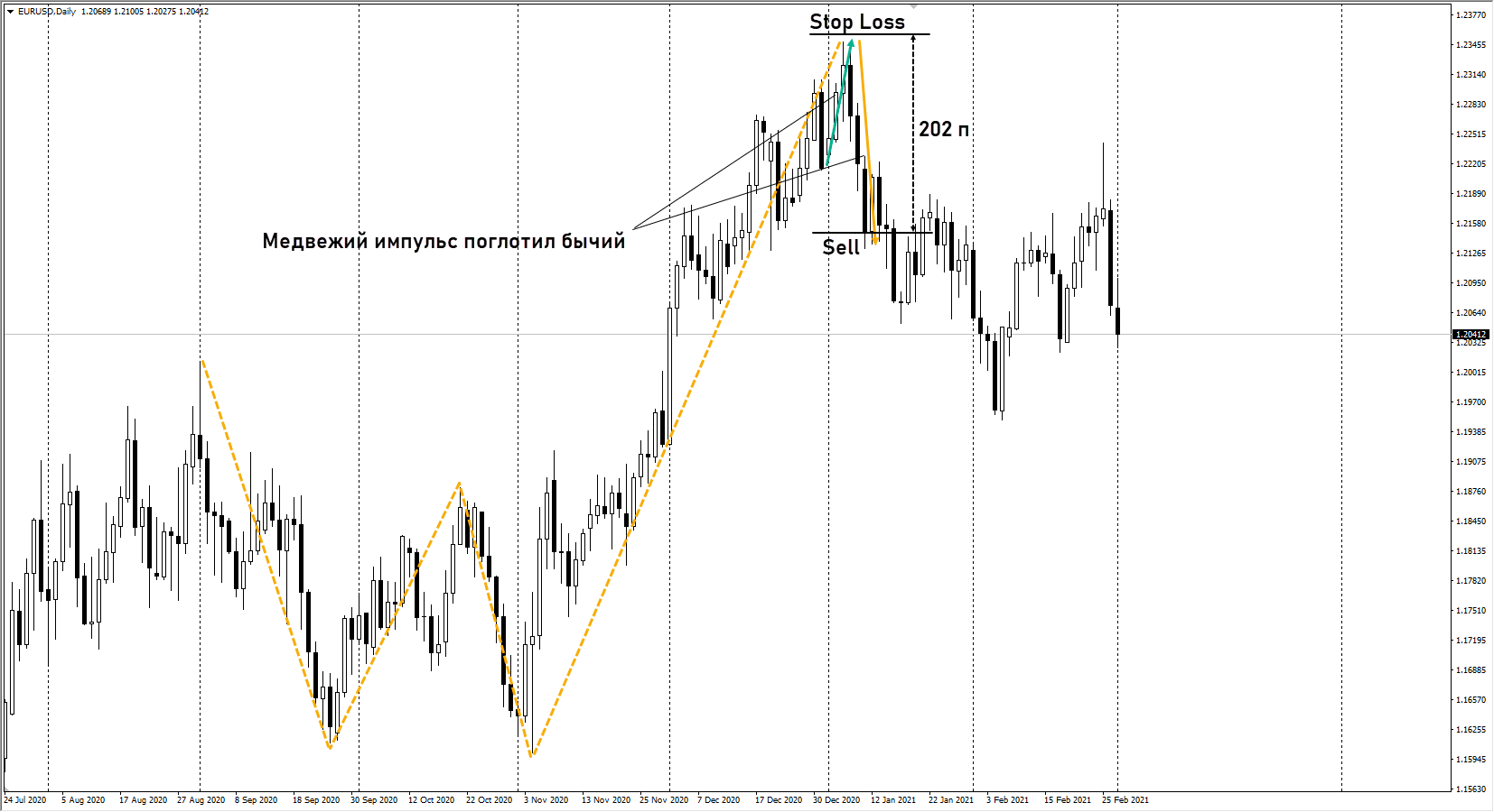 В примере подтверждение для продаж получено после того как медвежий импульс поглотил бычий. К этому времени стоп вырос до 202 пунктов.
