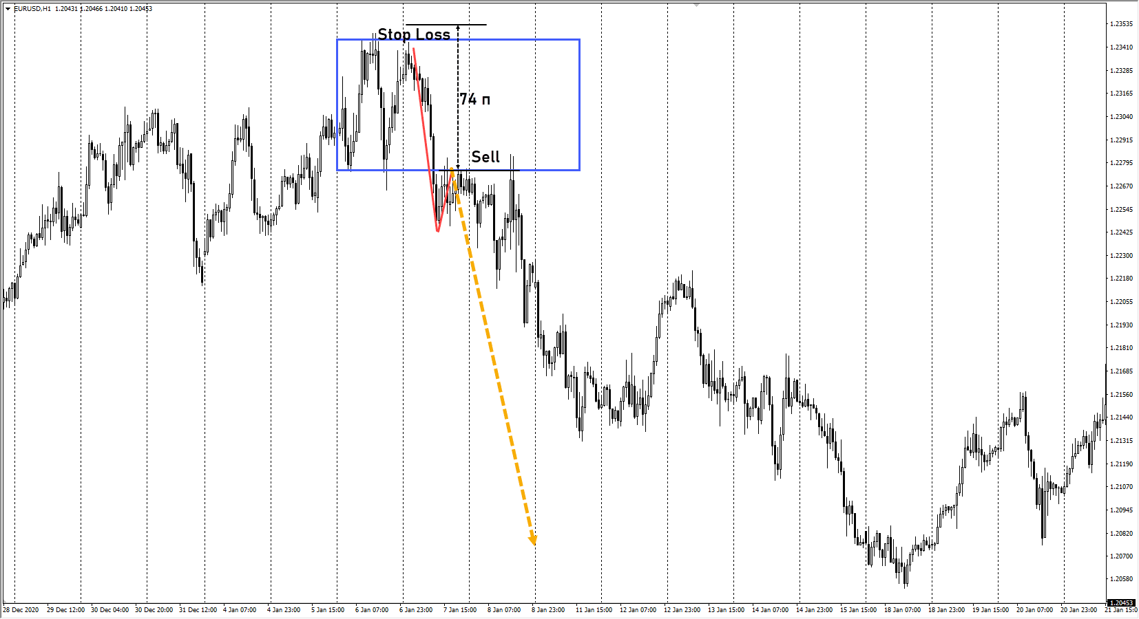Уточнение точки входа на младшем временном интервале позволяло войти в рынок раньше, снизить стоп и повысить отношение профита к риску. На часовом графике при формировании точки Е наблюдался диапазон, позже график пробил импульсом его нижнюю границу.