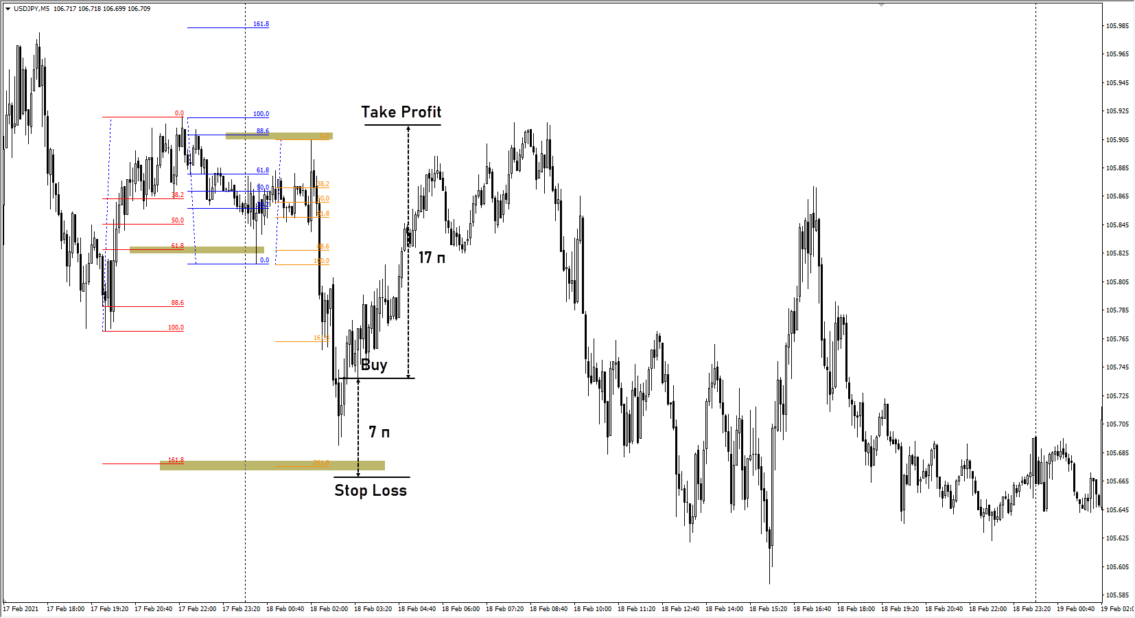 Соотношение риска к профиту находится на уровне 1 к 8-9. Если бы вход выполнялся на таймфрейме D1, то соотношение находилось бы в районе 1 к 3.