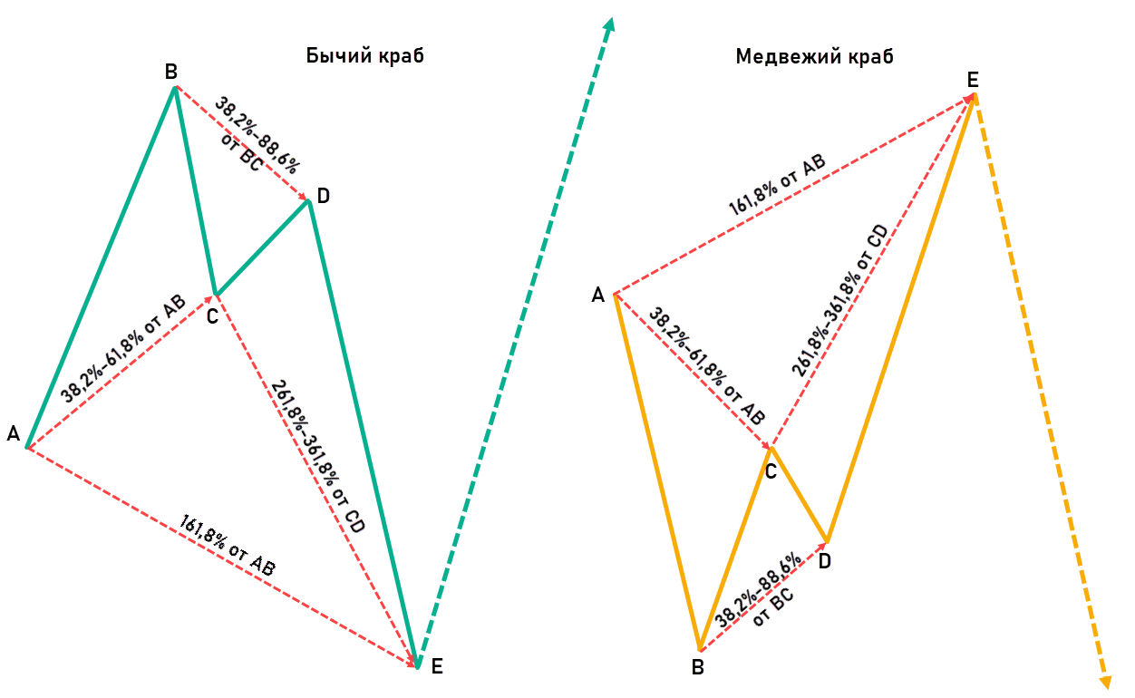 Гармонические паттерны Гартли – это пятиточечные конструкции, позволяющие с высокой точностью предсказывать поведение графика в будущем. Паттерн краб внешне напоминает иные конструкции Гартли, но отличается измененными соотношениями отдельных элементов. Модель универсальна, формируется на всех типах активов и неплохо отрабатывает – ее стоит включить в свой арсенал.