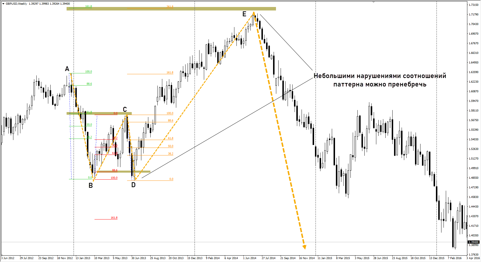 На старших таймфреймах формирование краба может занимать месяцы и даже годы. На недельном графике GBPUSD первая точка входа конструкции образовалась в декабре 2012 г., а завершающая – в середине лета 2014 г.