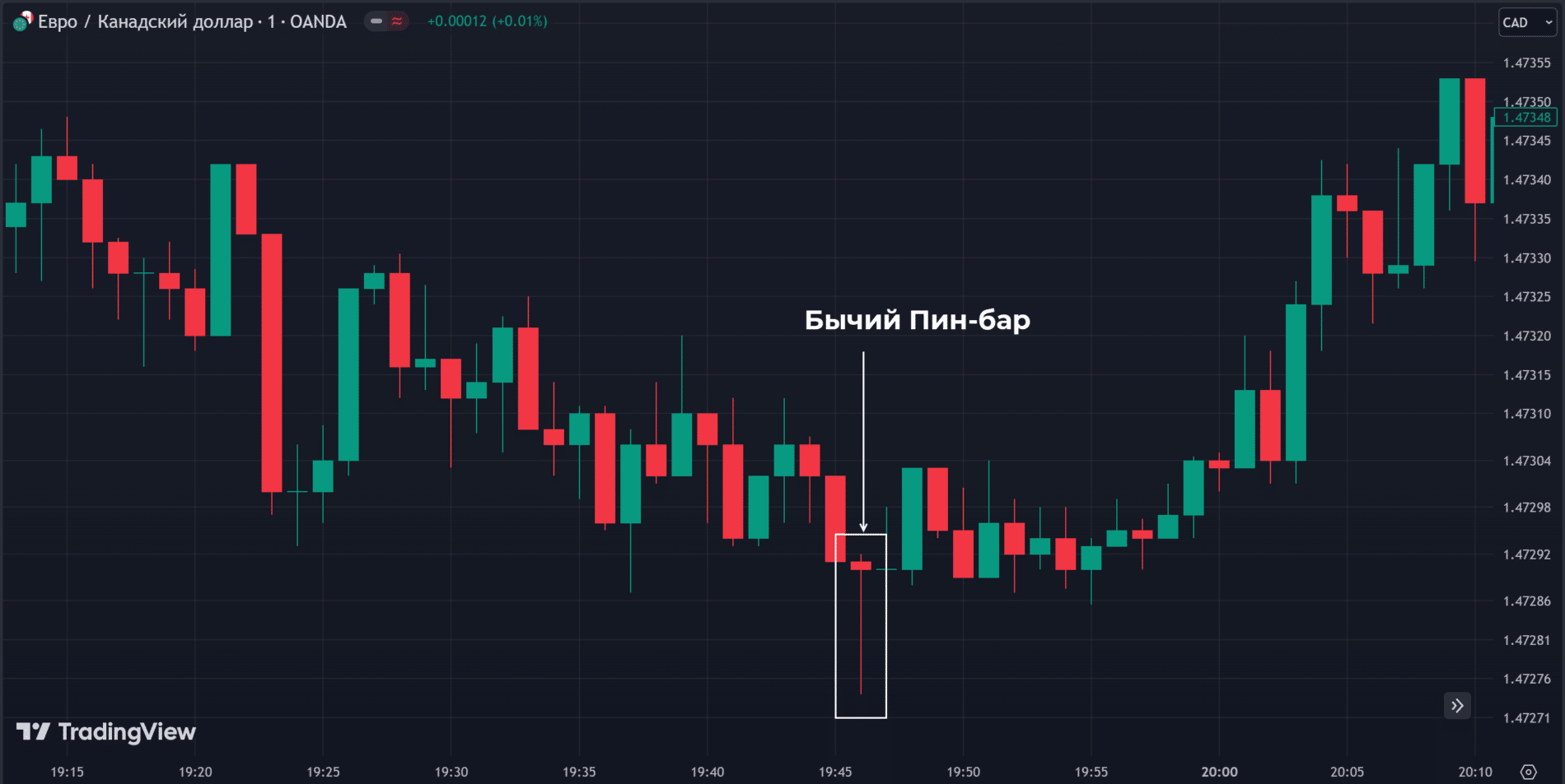 - Если длинная тень находится снизу, а верхней тени нет либо она невелика и паттерн появился на минимуме, то речь идет о модели бычий Пин-бар. Как и перевернутый молот — это бычий паттерн, но более сильный. Нижнюю тень можно рассматривать как смену расстановки сил на рынке.