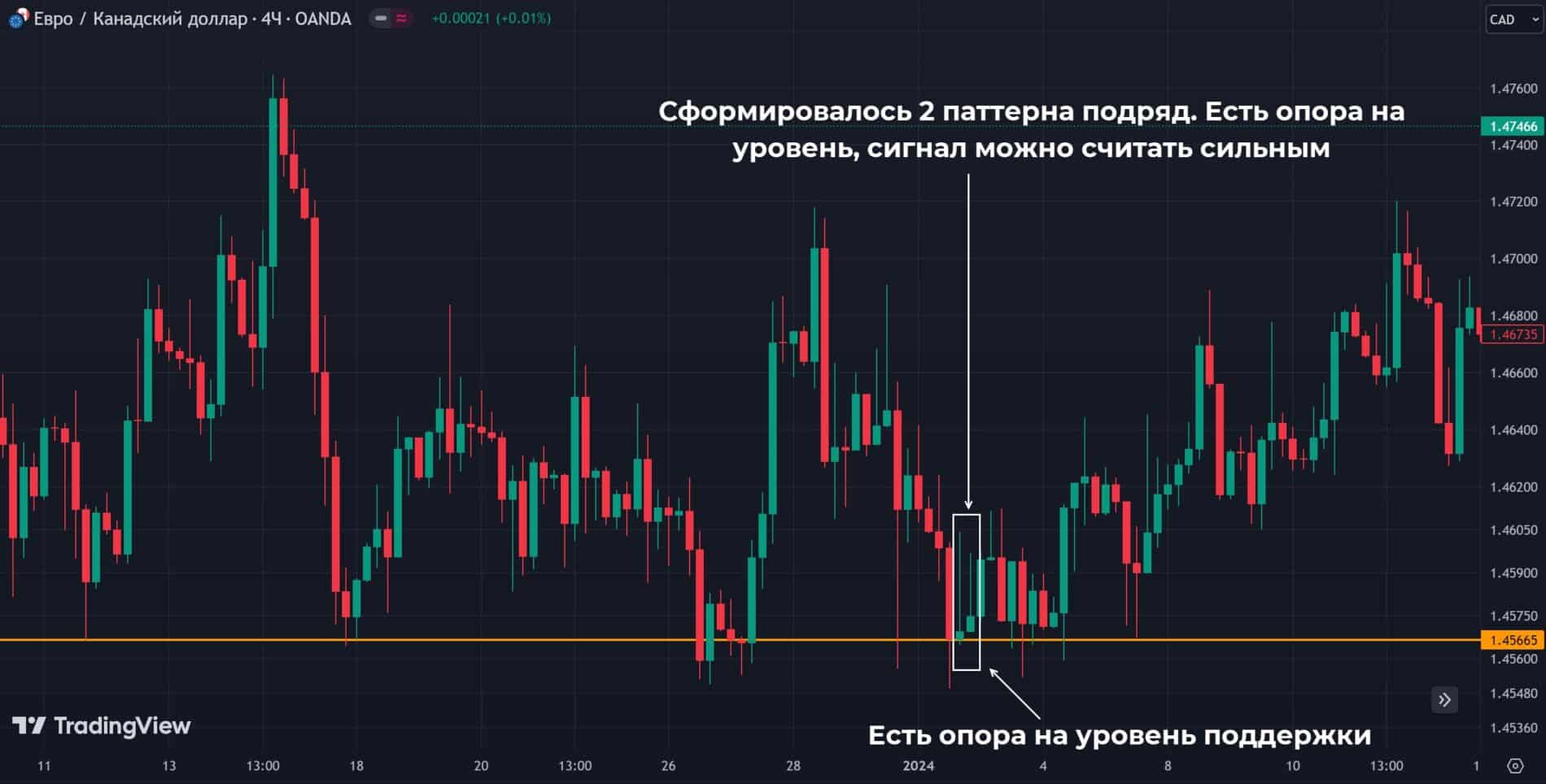С точки зрения надежности это паттерн средней силы. Он слабее Пин-бара, после него не исключено продолжение нисходящего движения и обновление минимума. Это не самостоятельная торговая стратегия, а скорее неплохое дополнение стандартного арсенала трейдера.