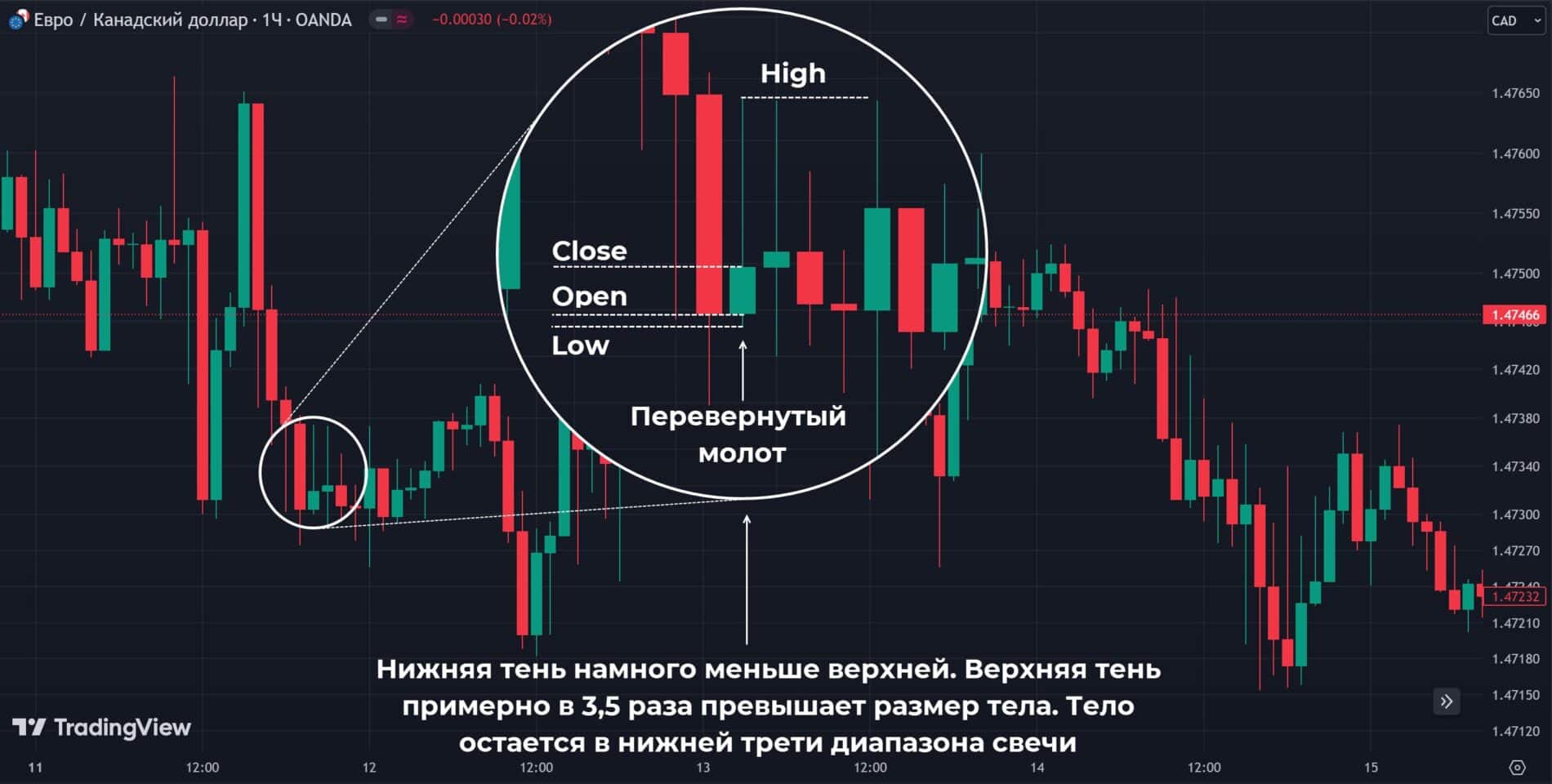 Свеча Перевернутый молот относится к простейшим свечным паттернам. Для его идентификации на графике не нужны индикаторы и сложная разметка, достаточно беглого анализа.