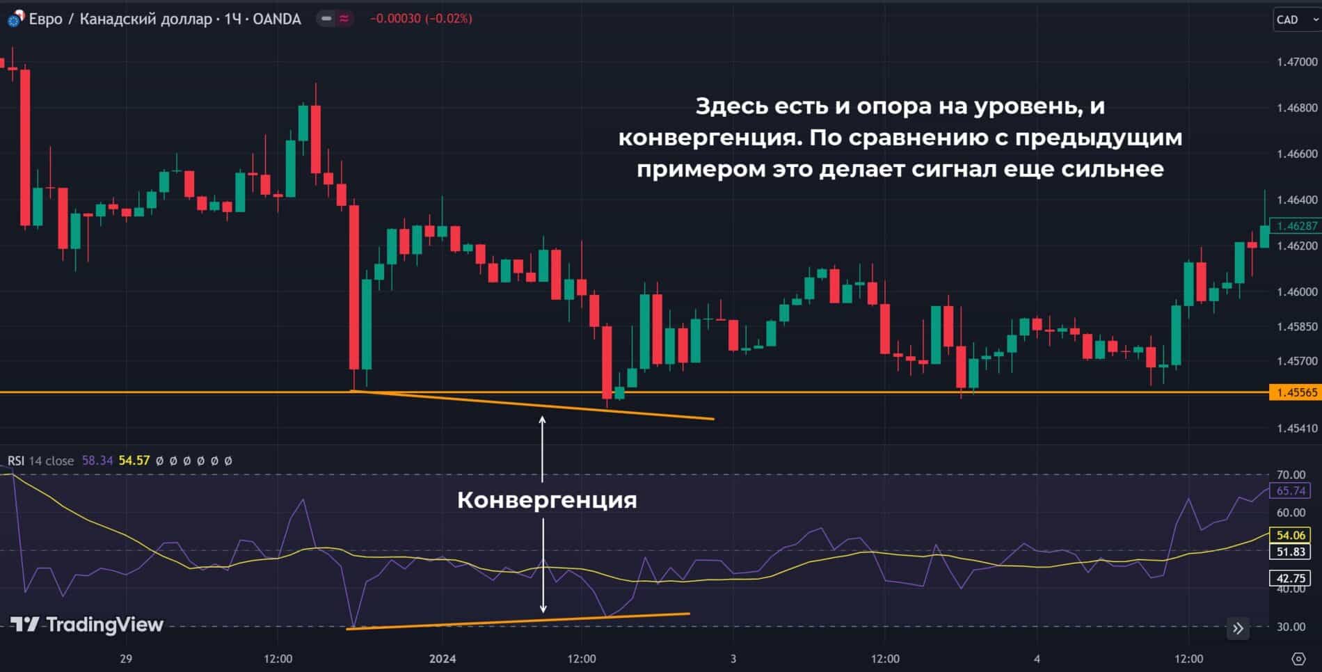 - Выход линии осциллятора из зоны перепроданности/перекупленности. Например, формируется Перевернутый молот в трейдинге после падения, параллельно RSI или Стохастик выходит из области перепроданности. Сигналы могут немного не совпадать по времени – сначала появляется паттерн, а позже поступает подтверждение от индикатора.