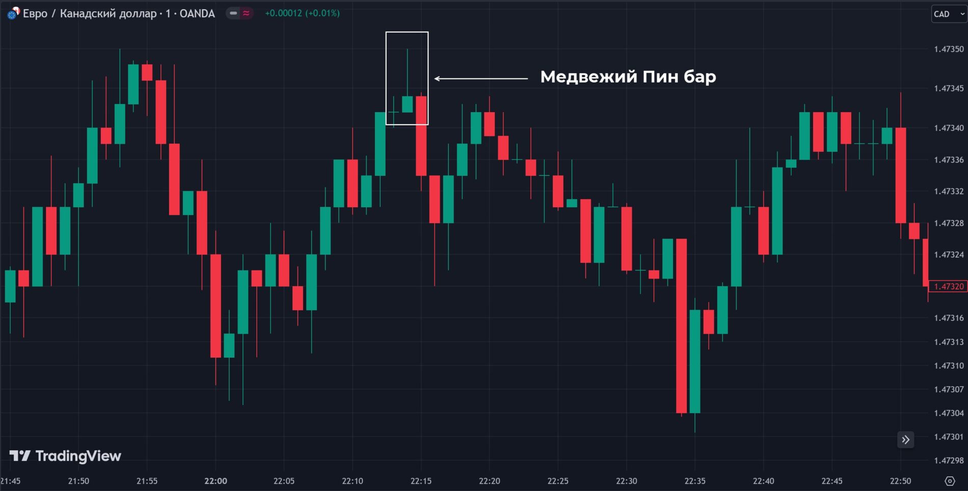 - Свеча медвежий пин-бар. Конфигурация свечи та же, но она формируется в зоне максимумов после восходящего движения. Это медвежий сигнал, иногда модель называется Падающей звездой.