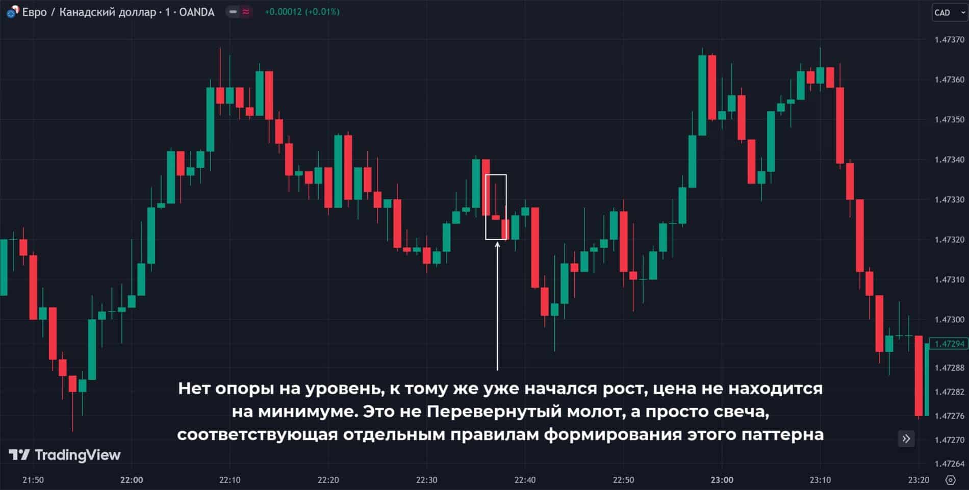 - Диапазон должен быть сопоставим с диапазонами соседних свечек. Если Перевернутый молот слишком большой, то паттерн лучше проигнорировать.
