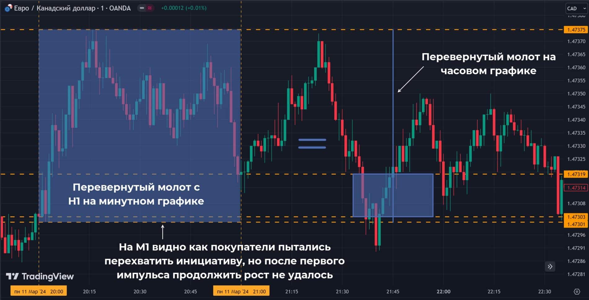 На младшем таймфрейме видно, что при формировании перевернутого молота покупатели на какое-то время перехватывают инициативу. Но после первого импульса появляется сопротивление со стороны медведей. Поэтому дело ограничивается только свечным паттерном, а не полноценным разворотом с сильным импульсным ростом.