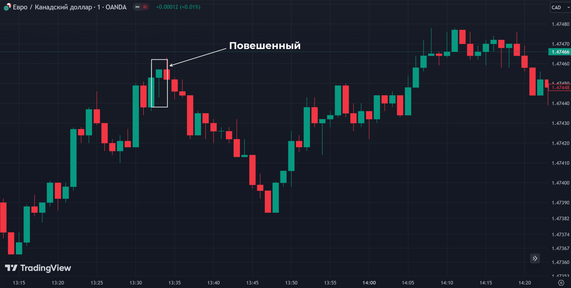 - Если свеча с длинной нижней тенью появляется на пике бычьего движения, то получаем паттерн Повешенный. Это зеркальная модель по отношению к Перевернутому молоту, указывает на слабость покупателей и возможность медвежьего разворота.
