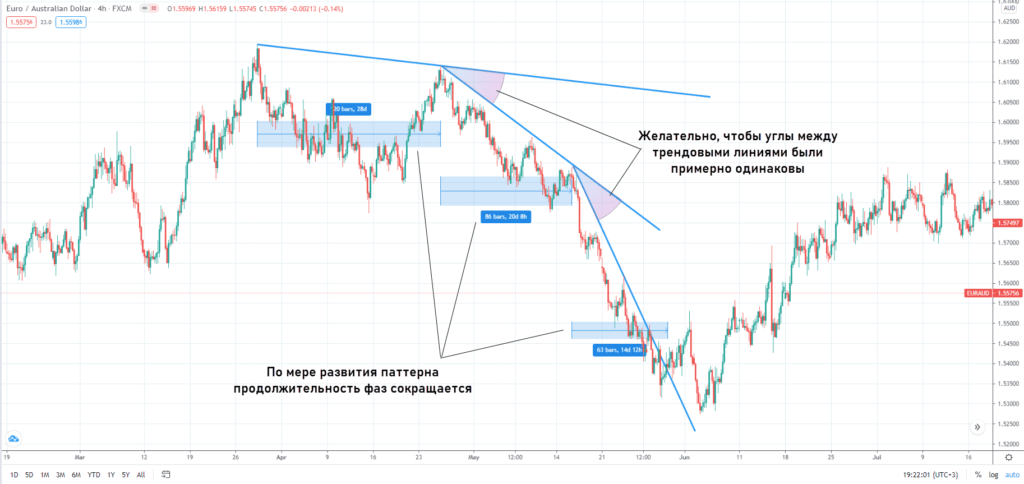 Что касается целей, то первая цель – первая трендовая линия. Здесь нужно закрыть как минимум половину объема, а по остатку перенести стоп-лосс на уровень входа в рынок и использовать ручной либо автоматический трейлинг-стоп. Можно фиксировать профит частями по 25% на трендовых линиях №1 и №2. Логика сохраняется независимо от таймфрейма и инструмента, на котором сформировался паттерн.
