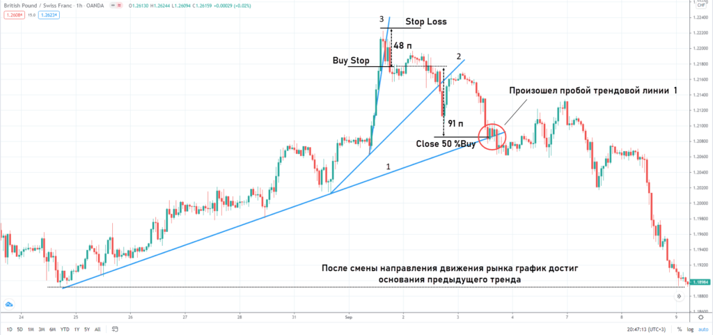 Закрепление под трендовой линией №1 указывает на смену тренда. Если часть объема еще остается в рынке, не торопитесь закрывать его. При смене направления движения рынка график может достичь основания предыдущего тренда.