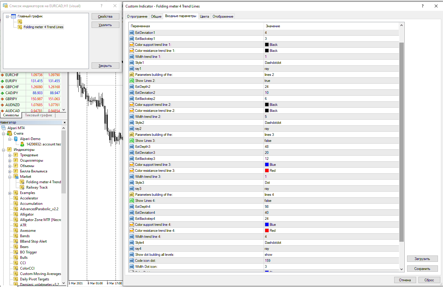 Через настройки можно менять параметры четырех зигзагов, использованных для построения трендовых линий. Прочие пункты настроек скорее косметические и отвечают лишь за толщину линий, отступ маркеров от свечей и прочие нюансы.