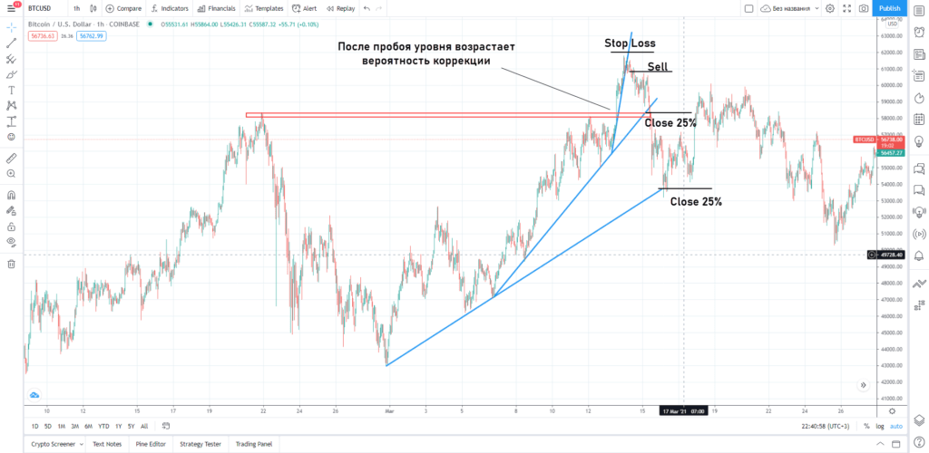 При ретесте уровня стоп переносится в безубыток и часть объема закрывается. Это страховка, неизвестно как поведет себя график после ретеста пробитого сопротивления или поддержки.