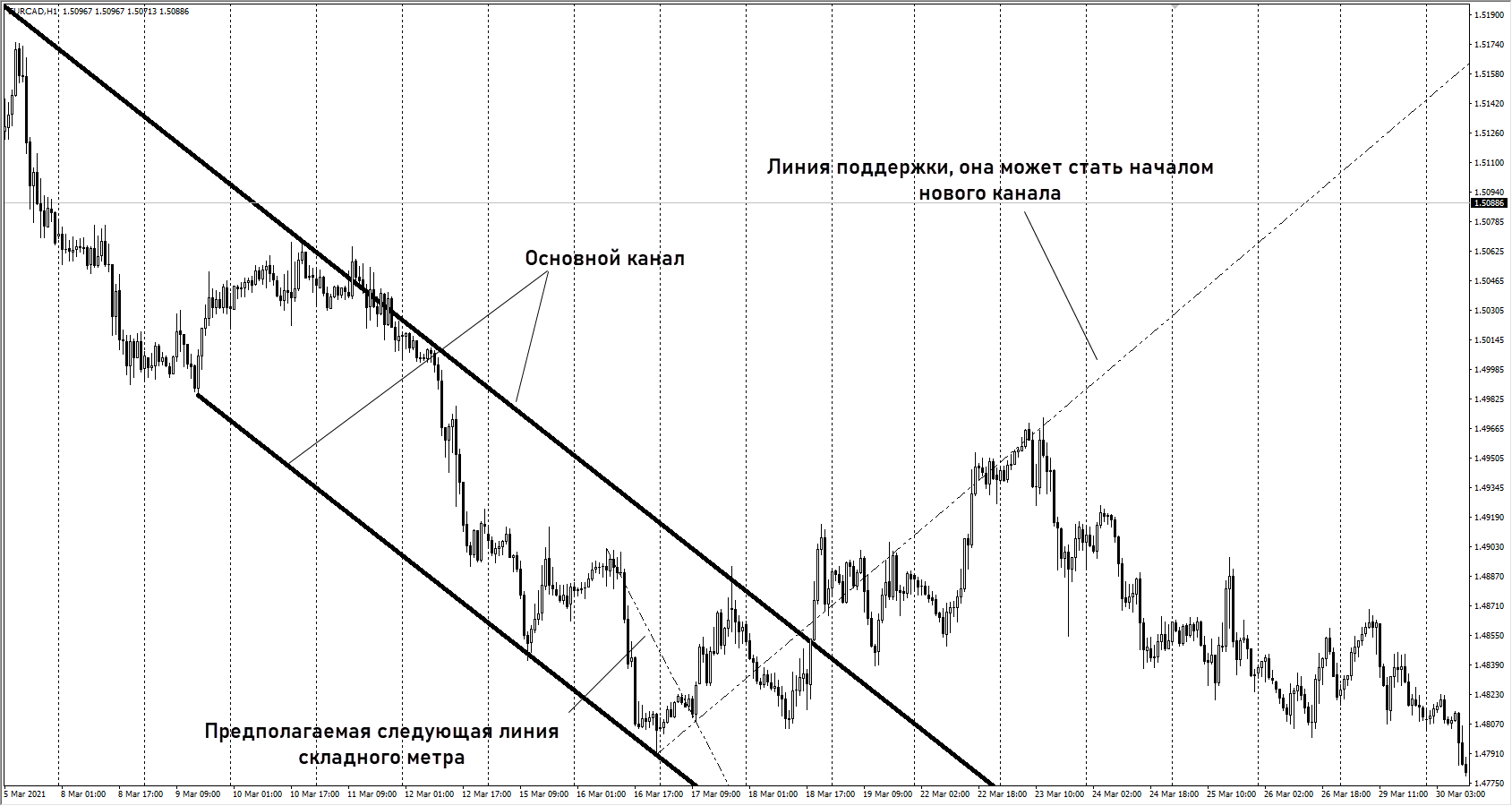 При разметке графика индикатор строит ценовой канал – это основа для дальнейшей работы. Затем он пытается спрогнозировать варианты формирования складного метра с учетом ожидающегося ускорения роста/падения котировок (эти линии обозначаются пунктиром). Также Folding meter 4 Trend Lines можно использовать для автоматического построения каналов, выделения треугольников, клиньев и других фигур графического анализа.