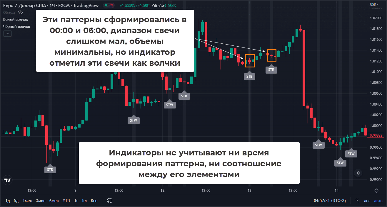 Есть индикаторы, автоматизирующие поиск паттерна. В TradingView есть индикаторы под названием белый и черный волчок, они ищут фигуры по цвету тела, белые модели выделяются как STW, черные – STB.