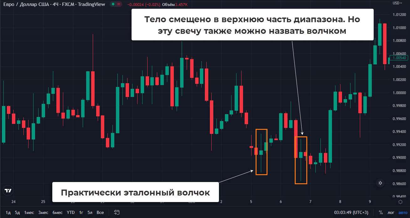 Иногда белым и черным волчками называют свечи с соответствующим цветом тела. Это нелогично, при классификации нужно учитывать зону, в которой сформировался паттерн. Тело может быть любого цвета, иногда его размер не превышает нескольких пунктов.
