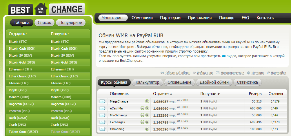 - если нет знакомых, подойдут онлайн-обменники (в мониторинге bestchange можно найти лучший), позволяющие обменивать деньги напрямую с банковских карт и кошельков других ЭПС. Цепочка выглядит так: деньги с вашей карты отправляются на Пейпал кошелек обменник, а уже с него – на ваш кошелек. Курс невыгоден, за счет такой схемы потеряете порядка 8-10%.