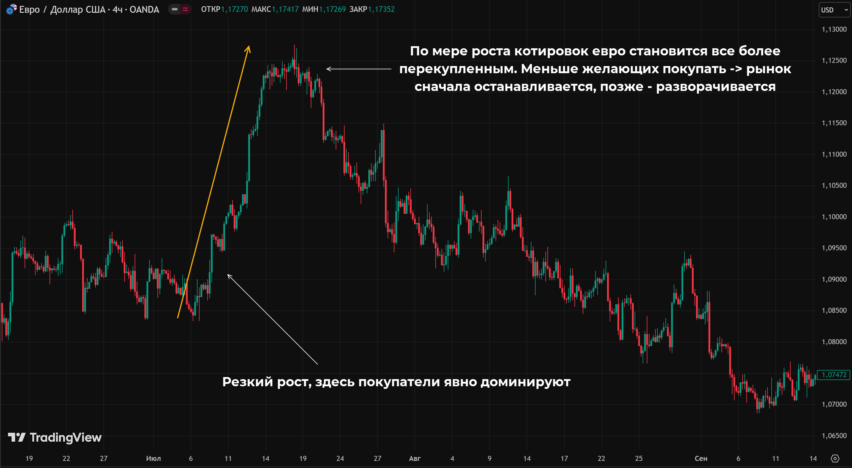 Когда говорят, что рынок перекуплен или перегрет, то имеется в виду чрезмерная активность покупателей. Быки выкупают любое предложение, за счет этого график растет, может обновлять локальные и абсолютные экстремумы. Это не может продолжаться долго, рано или поздно «топливо» закончится, не будет желающих покупать актив по настолько высокой цене.
