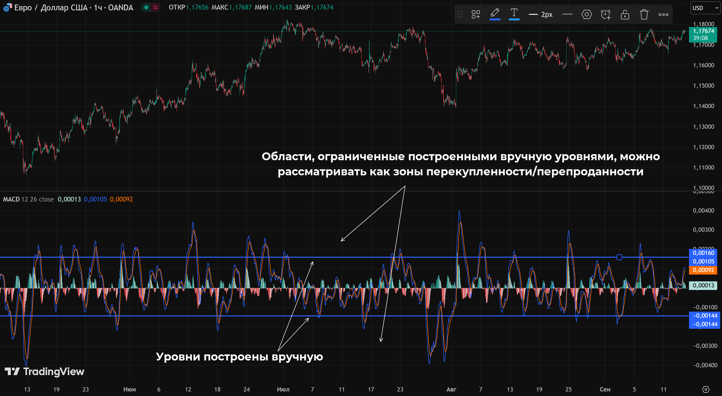 • Если у осциллятора нет фиксированных границ зон, их можно построить вручную, уменьшив масштаб графика. Этот подход работает с MACD, индексом товарного канала и рядом других индикаторов. При построении уровней ориентируйтесь на поведение графика, границы должны быть построены так, чтобы линия индикатора лишь изредка входила в зону перекупленности/перепроданности.