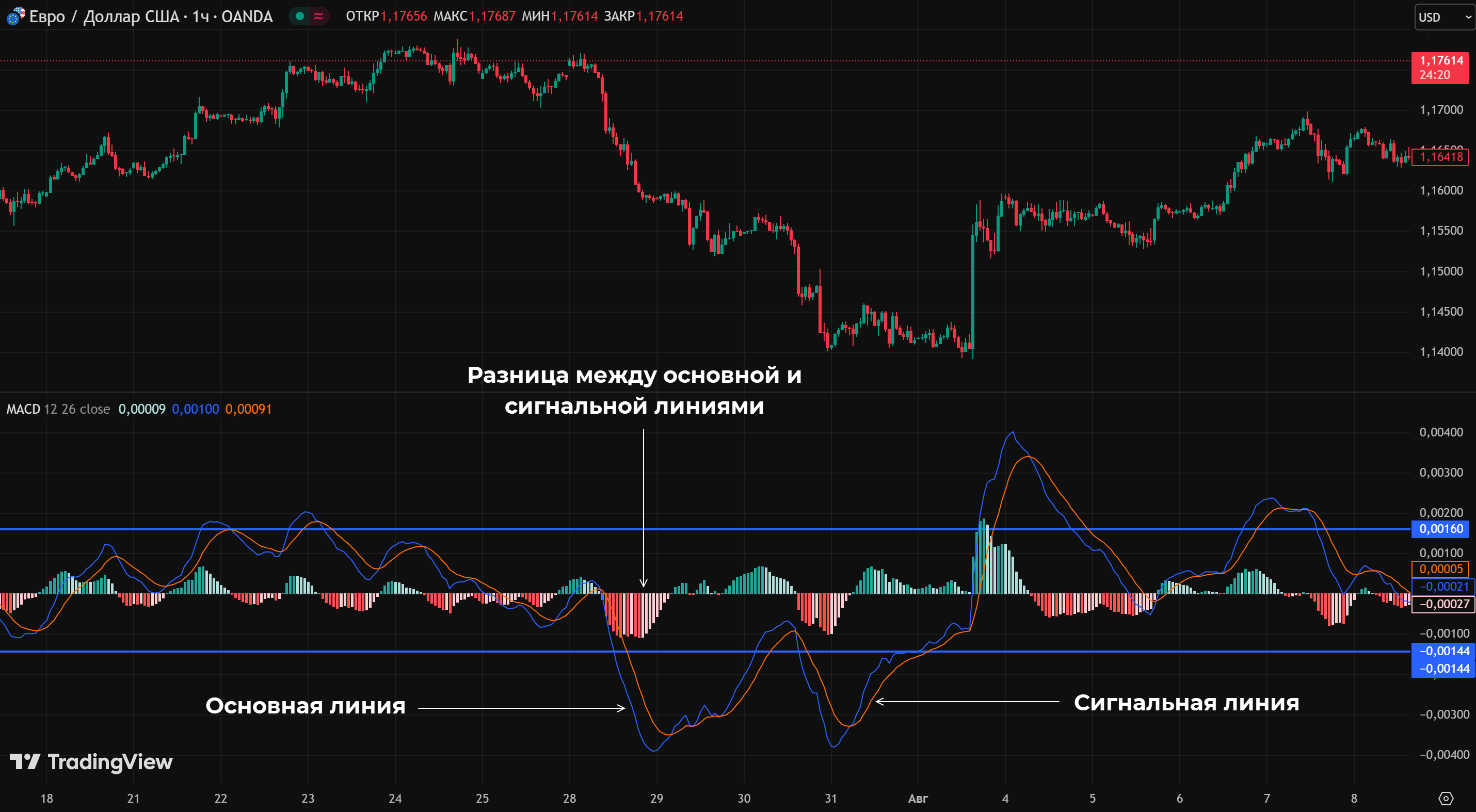 • Пересечение средней линии. Направление пересечения может использоваться как подтверждение продолжения движения.