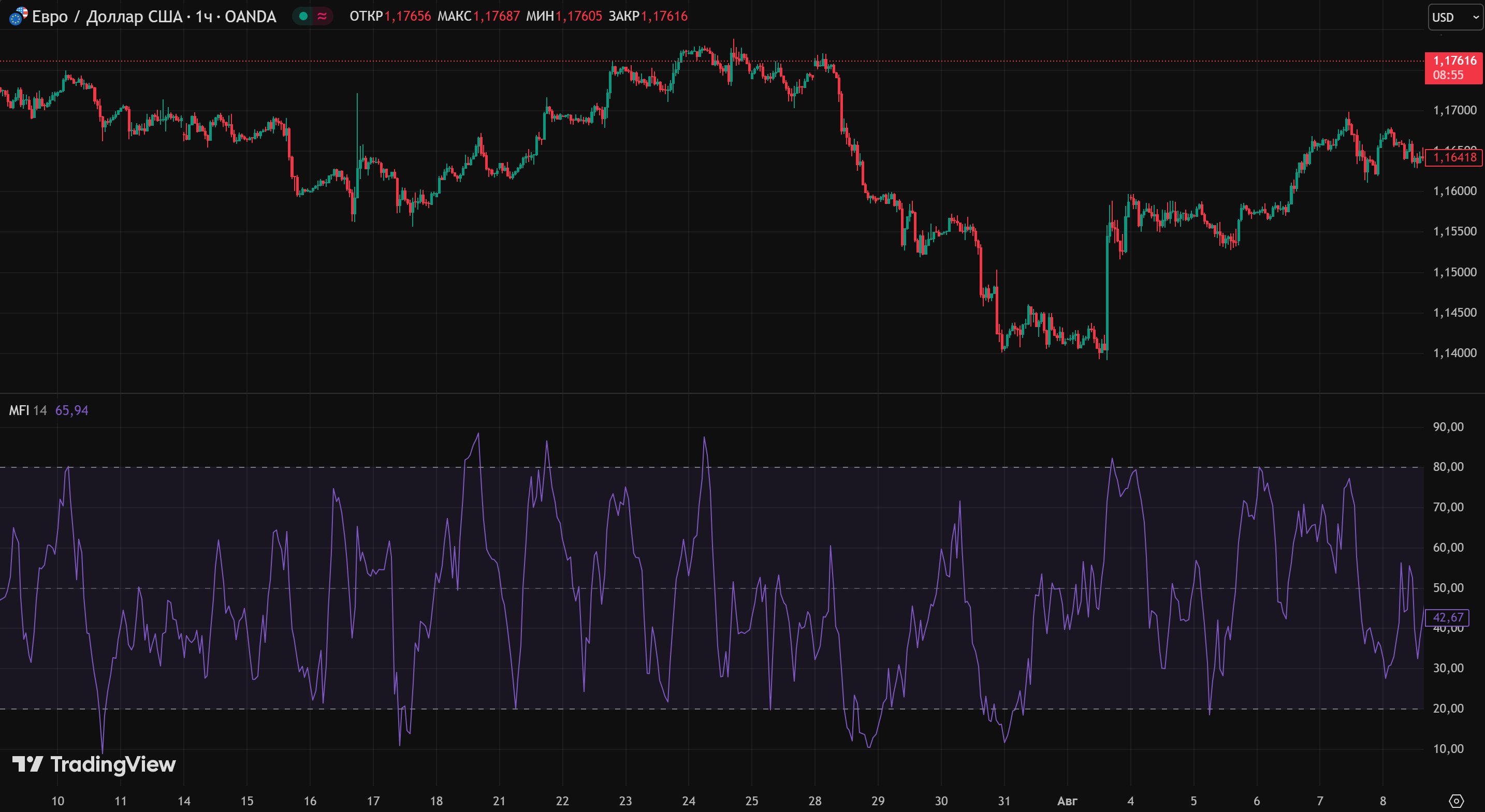 • MFI (Money Flow Index). Трейдеры называют его «RSI с объемами», в расчётах используется типичная цена (High + Low + Close)/3, умноженная на объём (Money Flow). Итоговый индекс рассчитывается аналогично RSI, но с учётом положительных и отрицательных денежных потоков. При настройках по умолчанию границы зон установлены на уровнях 20 и 80, их можно не менять. Даже при стандартных настройках MFI неплохо фильтрует большую часть ложных сигналов.