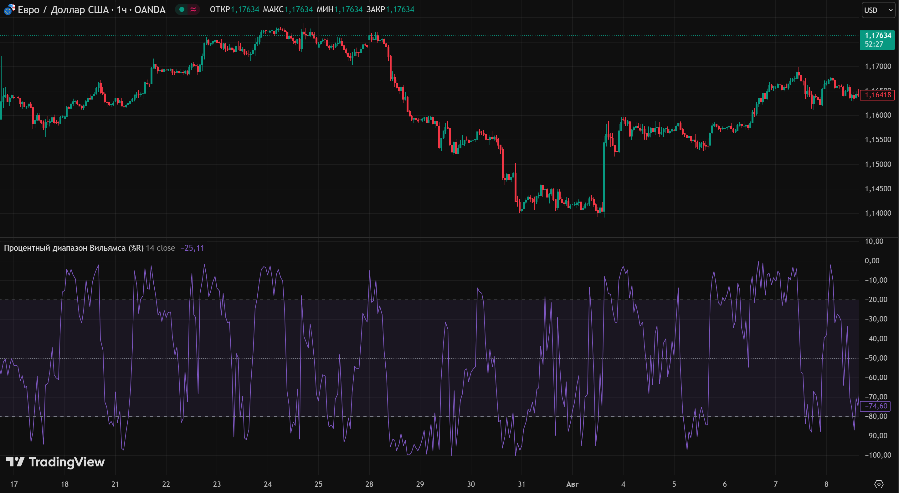 • WPR (Williams percent Range). Текущая цена Close сравнивается с самым высоким максимумом/минимумом на отрезке, заданном трейдером. WPR может принимать значения от 0 до -100, областью перекупленности считается зона 0…-20, перепроданности – -80…-100. Принцип работы тот же, что и в случае с RSI, MFI.